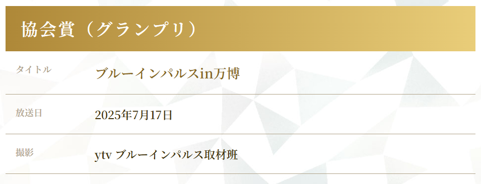 ytv出品の「ブルーインパルスin 万博」はニュース部門で金賞を受賞し、4部門の金賞作品の中から協会賞に選ばれました。読売テレビの協会賞受賞は2年連続となります。 このほか、スポーツ部門では「大谷高校競技かるた部」が金賞を受賞、企画部門では「沖島で育つ子供たち」が銀賞に輝き、ytvは3部門で高い評価を受ける結果となりました。