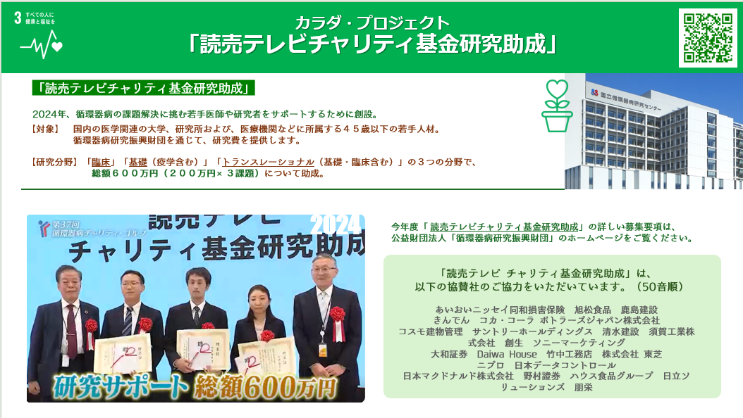 🟢今年度「読売テレビチャリティ基金研究助成」の詳しい募集要項は、公益財団法人「循環器病研究振興財団」のホームページをご覧ください。