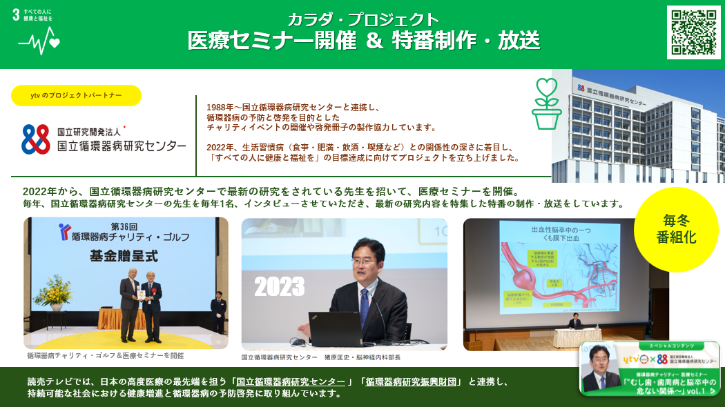 読売テレビでは、日本の高度医療の最先端を担う国立循環器病研究センター、循環器病研究振興財団と連携し、持続可能な社会における健康増進と循環器病の予防啓発に取り組んでいます。