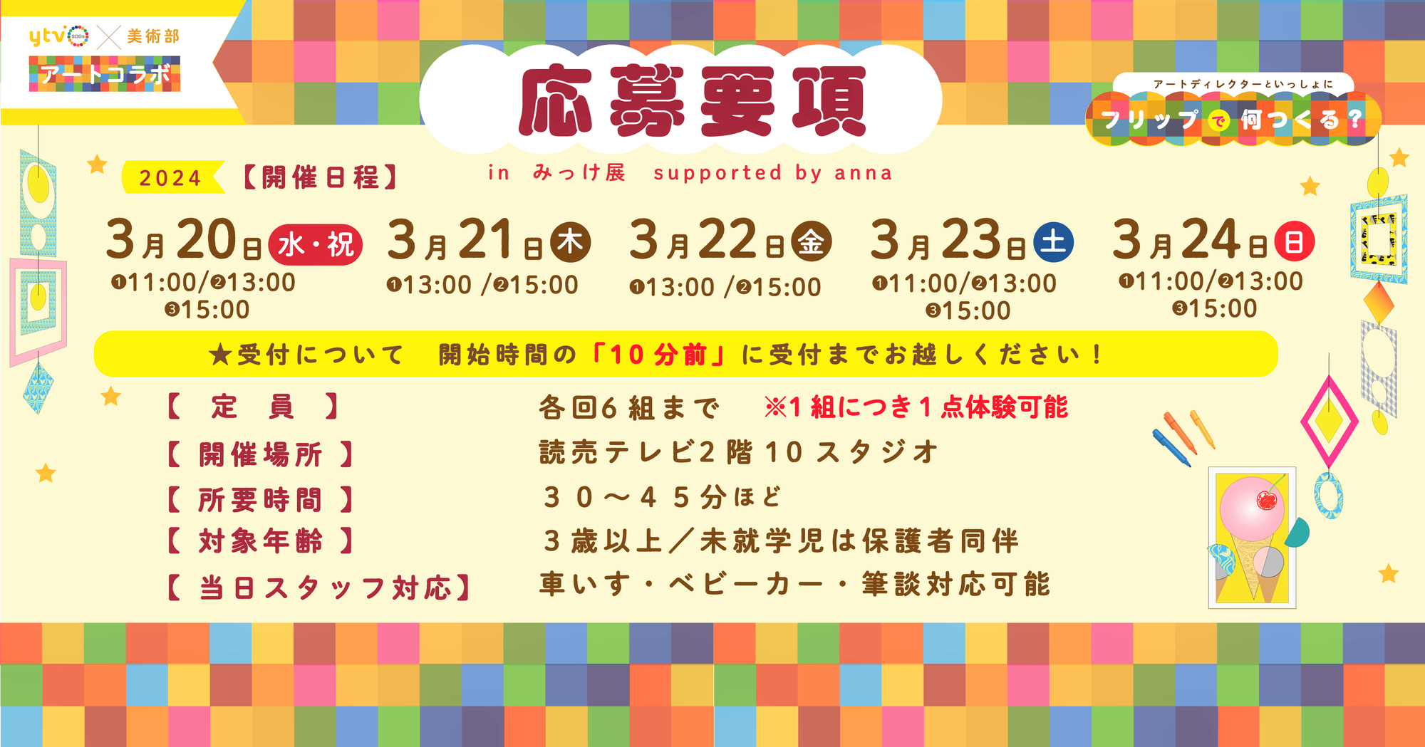 3月20日(祝)~24日(日)の5日間、ytv本社で開催する「みっけ展 supported by anna」にて、番組で実際に使われたフリップを活用したアップサイクルワークショップ「フリップで何つくる?inみっけ展 supported by anna」を開催いたします。