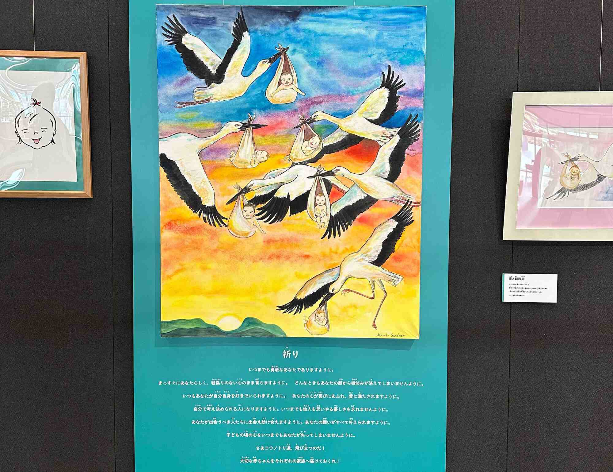 原画展には、絵本に掲載されている15点の原画のほかにも、親子の絆をテーマに描かれた絵画の数々が展示されました。こちらの巨大な絵画は「祈り」というタイトルで、原画展のために描き下ろされたものです。「子どもは神様からの預かりもの」という考えのもと、夜明けの空をコウノトリが赤ちゃんを飛び運ぶ情景が描かれ、子どもたちへの様々な祈りが込められています。