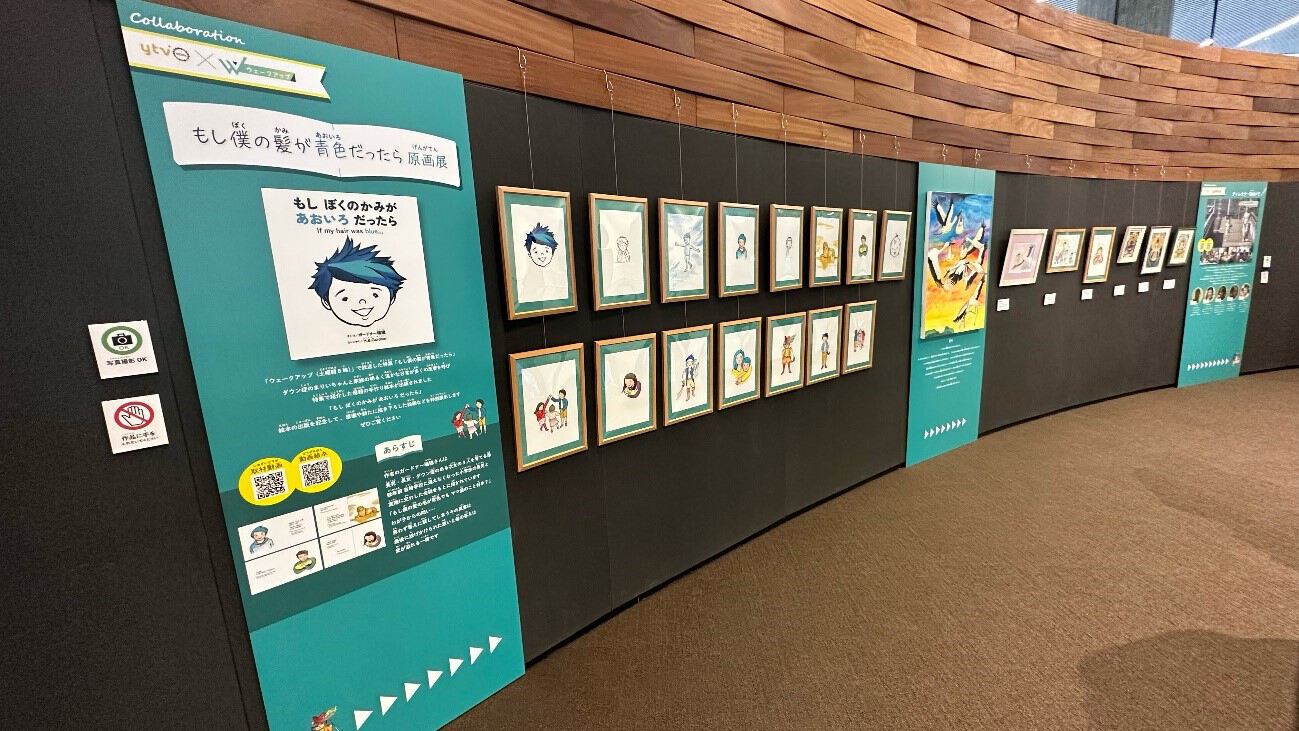 読売テレビ本社で3月に開催されたイベント「みっけ展 by supported anna」(3月20日~24日)の会場内で、報道番組「ウェークアップ」(土曜あさ8時~)の放送をきっかけに生まれた絵本「もし僕の髪が青色だったら」(もし ぼくのかみが あおいろ だったら)の原画展を開催しました。