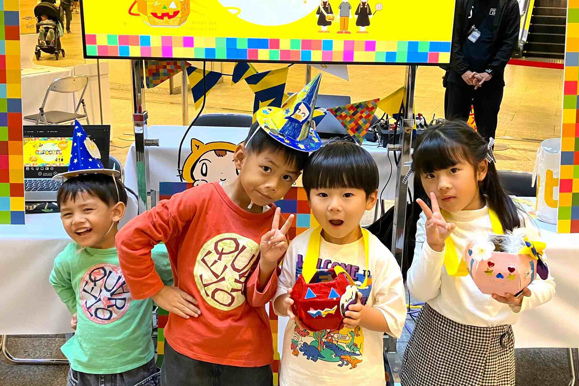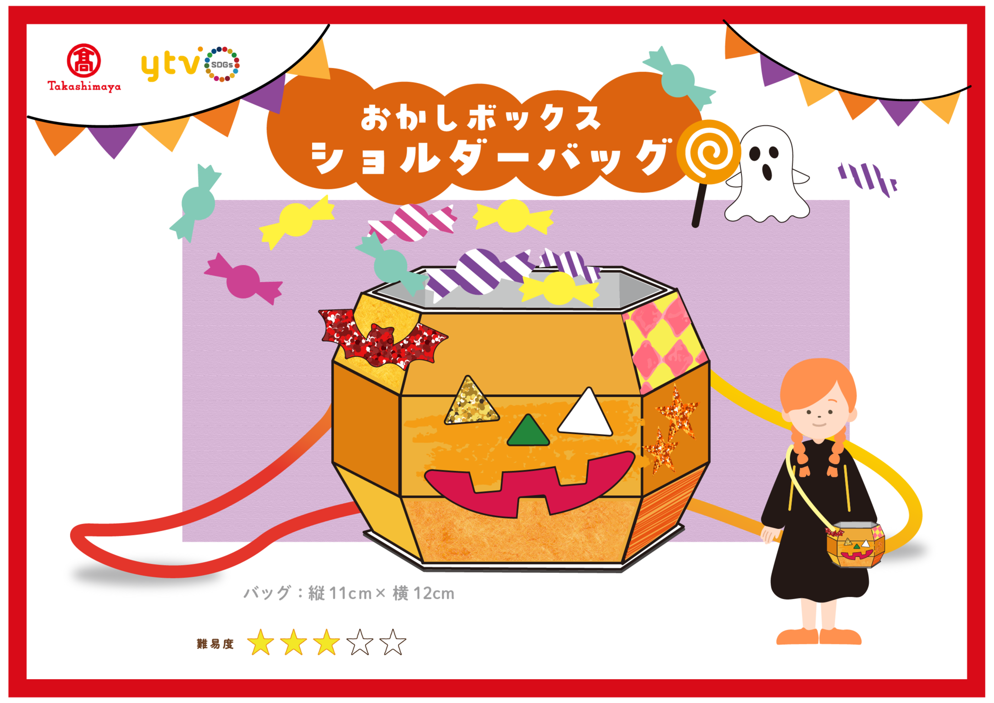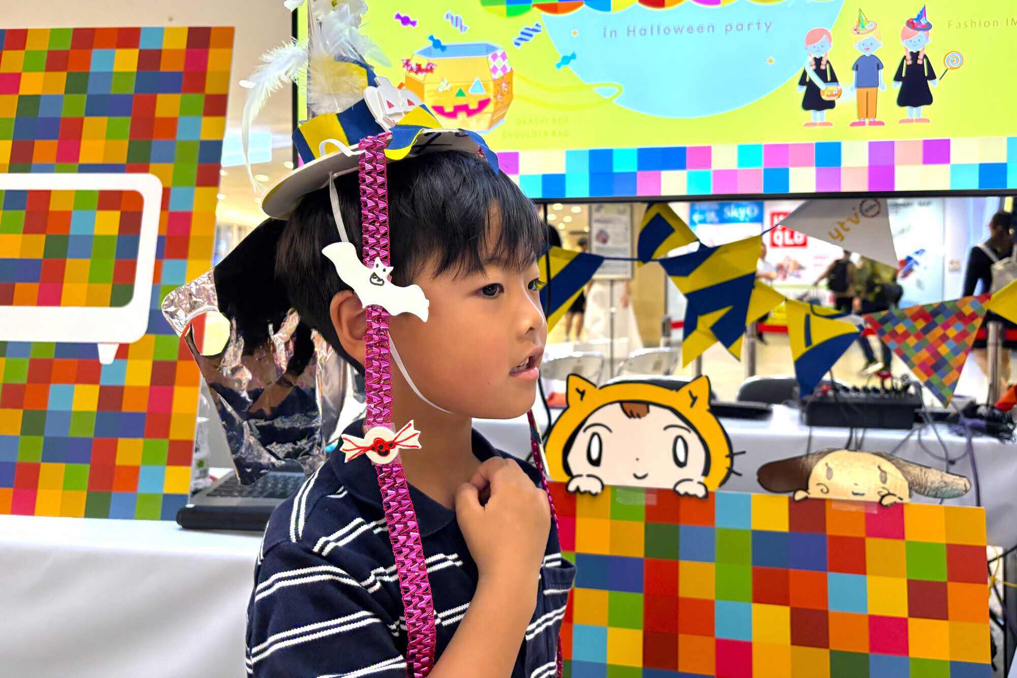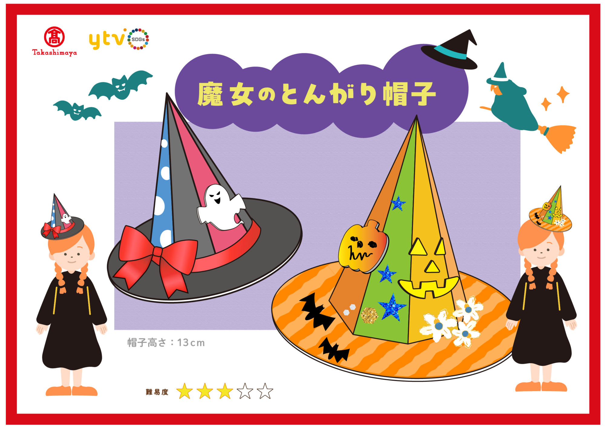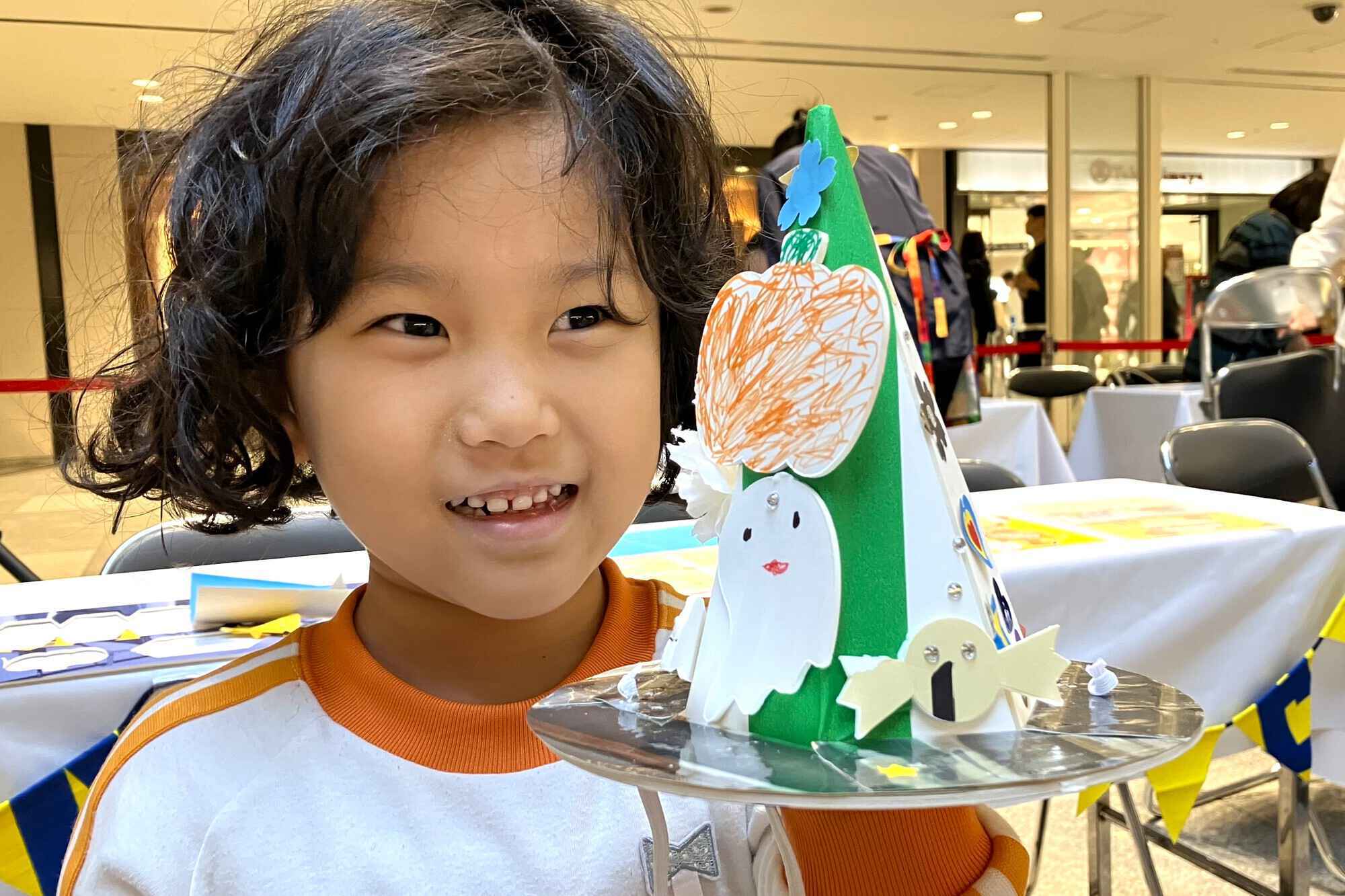 いつもは読売テレビの本社で実施しているワークショップを、人通りの多い地下街で行うのは初体験でしたが、3日間で6回開催したワークショップは、どの回も多くの親子連れらでにぎわい、‘満員御礼’の盛況ぶりでした。 今回のハロウィン・パーティー仕様の新作は、イベント出展にお声がけいただいた高島屋大阪店企画宣伝部の汪(おう)さんから、“子ども達が身に着けて楽しめる作品”をという提案を受けて、読売テレビ美術部のアートディレクターたちが開発しました。出来上がったのは、ハロウィンをモチーフにした「お菓子ショルダーバック」と「トンガリ帽子」の2作品で、「フリップで何つくる?」初の“ファッション・コレクション”シリーズです。