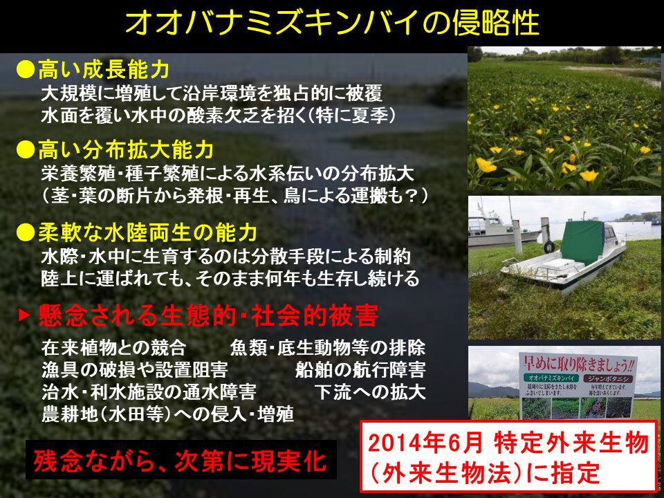 きれいな花です。今の時期(3月)はまだ花は咲いていません。この花が2009年に見つかり増え始めました。先住のナガエツルノゲイトウを押しのけるような形でどんどん出てきて、これは大変だということになりました。オオバナミズキンバイが成長し、ものすごい勢いで水面を覆ってしまうと、水中に光が差し込まなくなり酸素欠乏に陥ってしまうことで、魚や貝が住めなくなってしまいます。さらに、他の植物を押しのけて、この茎1本から根が出て再生して増えていくので、分身の術のようにどんどん広がってしまいます。茎は水の流れに乗ってどこへでも行ってしまうので、水の流れに乗ってどんどん広がっていくという問題が起こり、陸上にも生えるなど、いろいろな影響が懸念されるようになりました。動植物への影響、漁業への影響、船が通れない影響、さらには水・陸両性のため、農地にも入り生え続けていくと、稲の収穫ができなくなってしまうということも起こります。残念ながらこれらの問題が次第に現実化してきているということです。オオバナミズキンバイは特定外来生物に指定されています。外来生物法の規制対象になっています。