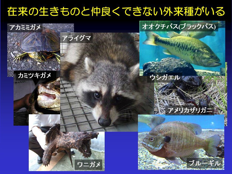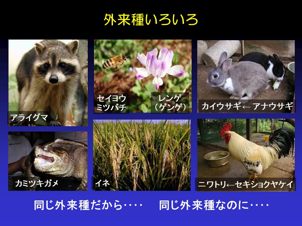 「日本人は米を食え」とよく言われるぐらいにイネは大切です。このように、私たちの生活を支える日本にいなかった生き物たちもたくさんいます。特に家畜や作物、野菜、果物のほとんどは外来起源です。私たちの生活は、もともと日本にいなかった生き物たちがいないと支えることはできません。直接輸入して持ち込むケースもありますが、日本で栽培、飼育されているものが私たちの生活を支える上で非常に重要です。もともと日本にいなかった、あるいはその地域にいなかった、外来のものだからという形で一括りにしないことが大事です。外来種の中にも問題となるものもいれば、役に立っているものもいるということです。外来種でもいろいろある、と考えてください。ただ残念なことに仲良くできない、問題を起こすものいます。実際、アカミミガメ、ウシガエル、アメリカザリガニ、アライグマ、オオクチバス、ブルーギルなど、もともと日本にいなかった特定の外来種の影響を放っておけなくなってきています。