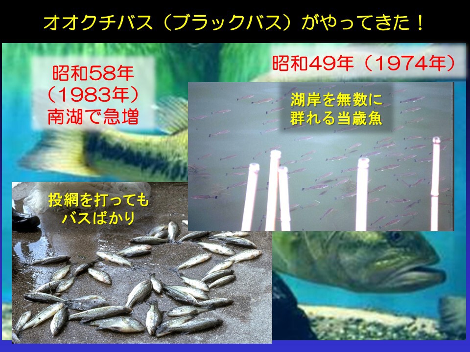 今からおよそ50年前、オオクチバスがやってきました。そして今から40年ほど前から南湖で急に増え始めました。