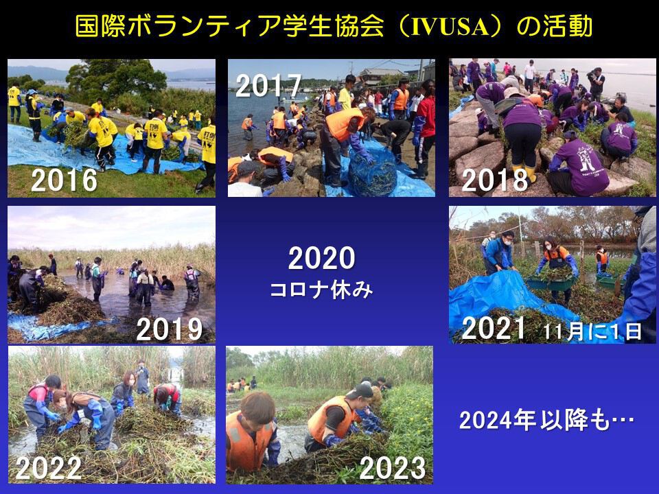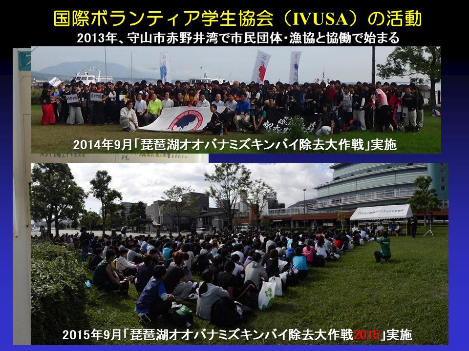 なんとか頑張って格闘して抑え込みます。こうした活動をIVUSA(国際ボランティア学生協会)の皆さんと連携してやっています。IVUSAさんは2013年から活動を始め、2014年には初めて「琵琶湖オオバナミズキンバイ除去大作戦」に、3日間で延べ1500人以上の学生たちが参加し駆除してくれました。そして2015年9月の除去大作戦にも参加してくれました。毎年やってもらえることを大変嬉しく思っていました。