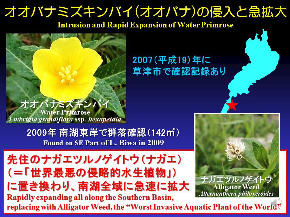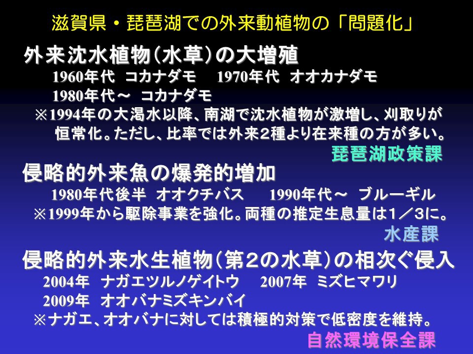 琵琶湖では水草が増え始めたのは1960年代からでした。その時増えたのはコカナダモやオオカナダモという外来種でした。その後1994年に大渇水が起こり、水位がマイナス123センチまで下がりました。それ以降、増えている水草は在来の種類が多いと言われています。つまり水草が増えすぎて問題を起こしているわけで、外来か在来かは関係なく、流れ藻になって岸に流れ着いて腐って臭いとか、船が通れなくなるとか、漁ができなくなるからということで、水草を適正な量に抑え込もうという対策がとられています。外来魚については、在来魚がどんどん減少する場合は、外来種のほうを減らさざるを得ないという取り組みが行われていています。オオバナミズキンバイなども、いろいろと問題を起こすので対策がとられています。