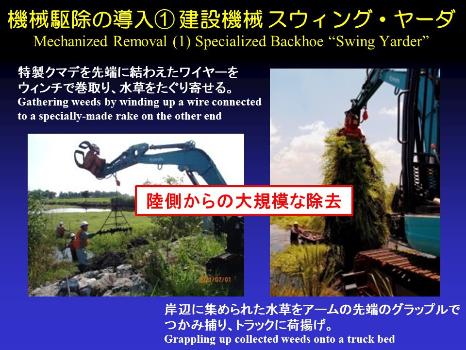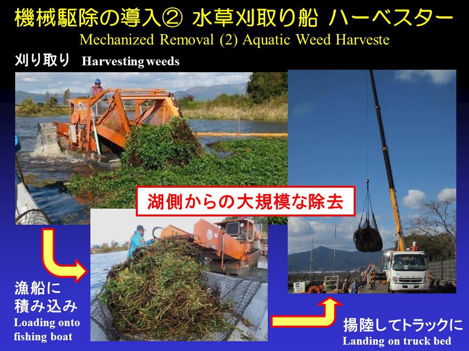 これは大変だということで私たちも放っておけないので、このように建設機械を使って、陸側から除去したり、湖側から取ることもやっています。これは水草刈取船「ハーベスター」というタイプの専用の船で、ガンガン取っていきます。このように岸側からも湖側からも機械でどんどん取っていっています。