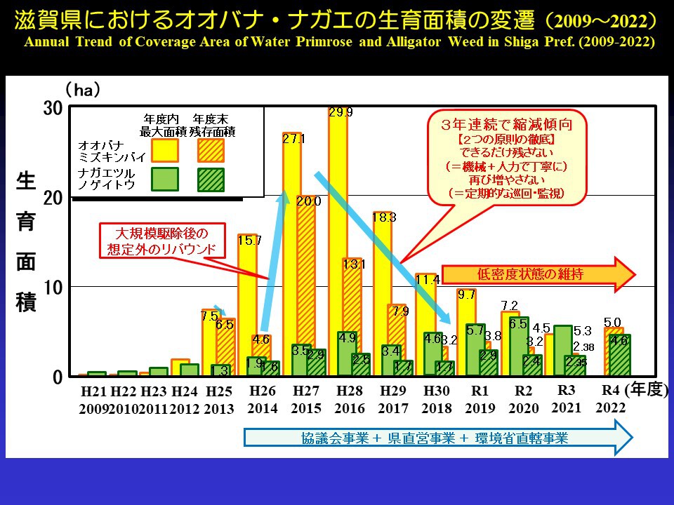 という2つの原則を守ることで管理ができる状態、低密度の状態を維持しています。2020年をピークに3年連続で減少させ、低密度の状態を維持しているというのが今の琵琶湖の状況ですが、最近少し増えています。