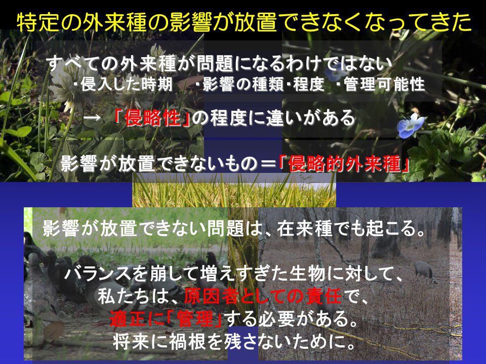 これは外来種の話をするときに必ず説明していることですが、外来種の対策を取るのは「単なるよそ者排除じゃないか」と言われることがありますが、「そうじゃありません」ということです。特定の外来種が問題になるのは、それがよそ者だから、外来起源だから、ではなく、あくまでも放っておけない影響があるから対応しているということです。特にマスコミの方々には外来種だからと一括りにするのは、やめてくださいと言っています。