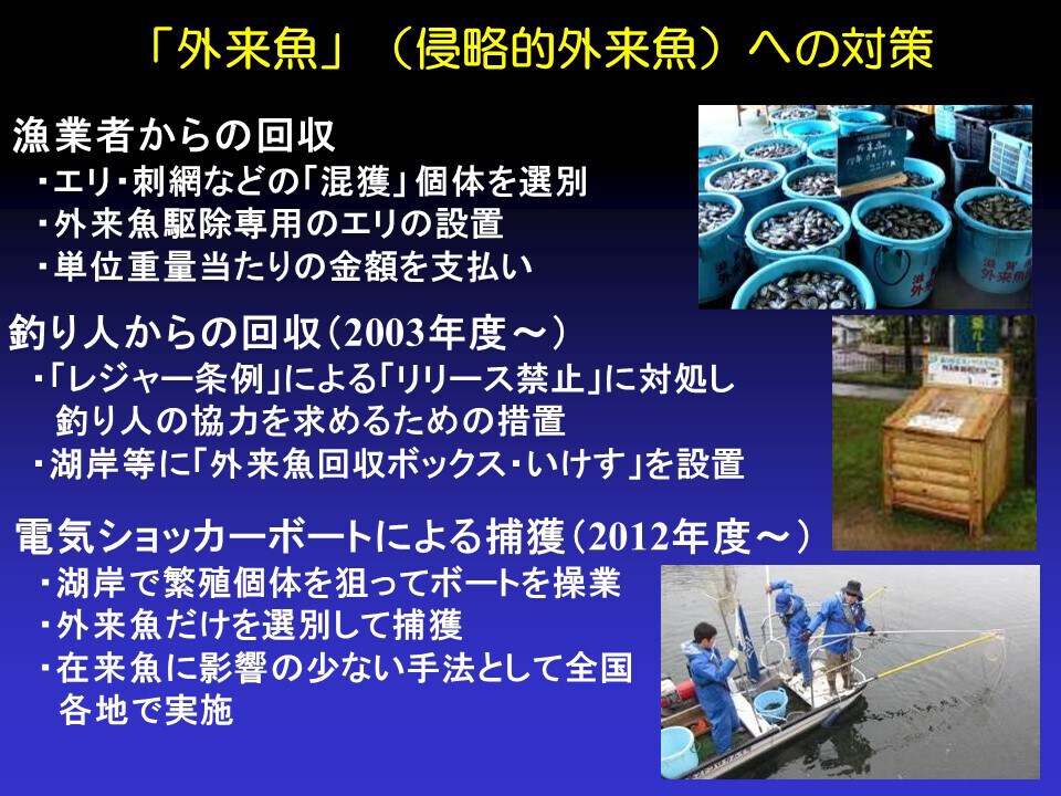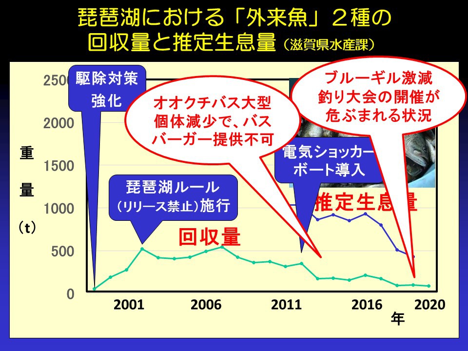 つまり、キャッチアンドリリースではなく、キャッチアンドキープしてください、そして回収ボックスに入れてくださいという協力を求めていました。頑張って釣ってくれたらその分だけ琵琶湖の外来魚が減るということです。こうした形で一人一人ができることが外来魚対策になりました。このほかにも、電気ショッカーボートで水中に電気を流して魚をしびれさせて、気絶してるうちにオオクチバスとブルーギルだけをすくいあげる。気絶からさめた在来魚は逃げていく、そのような取り組みも進みました。その結果、琵琶湖の外来魚の回収量は、2006年あたりをピークに減り続けています。