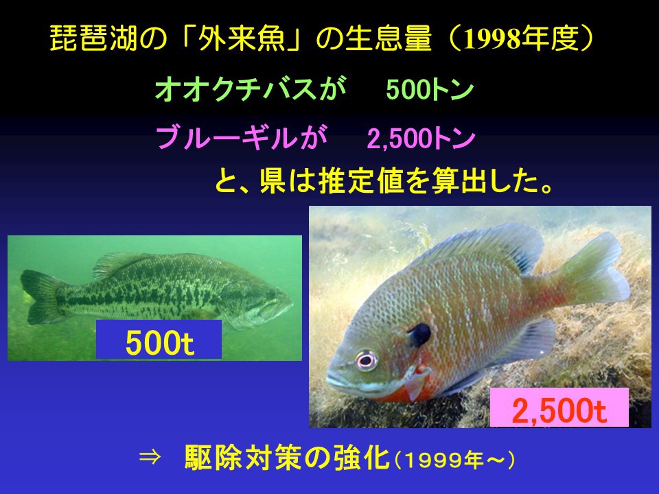 駆除事業が強化されたのは1999年、釣り人に協力を求めたのが2003年、今から21年前です。そして電気ショッカーボートを2012年に導入しました。これらの効果で水底の生息量がどんどん減ってきました。オオクチバスが減少したので、今まで琵琶湖博物館のレストランで出していた「バスバーガー」が、大きな切り身が取れなくなったため今、メニューとして出せなくなってしまいました。そしてブルーギルも最近減ってきて、釣り大会をやっても全然釣れなくて、楽しくないというくらいです。今、実はオオクチバスもブルーギルもなかなか釣れなくなっています。だからこそ1匹でも釣ることが大切になっています。