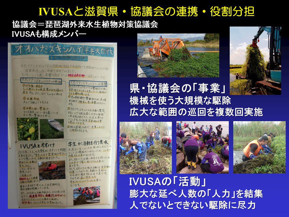 滋賀県の琵琶湖外来水生植物対策協議会に、IVUSAさんもメンバーに入ってくれています。その活動の一環をポスターで紹介しています。私たち滋賀県や協議会では、機械を使い大規模な駆除活動を行っています。しかし、それだけだと対応できない場所があります。石組湖岸やヨシの植栽地は、人の力でないと取れないような場所です。湖岸のゴミ拾いも同じです。今の技術では湖岸に掃除機を走らせて取るようなことはできませんから、人の手で回収しています。そういう状況はまだしばらく続きます。つまり、こうした人の力でないとできない作業で環境問題に貢献することができるわけです。