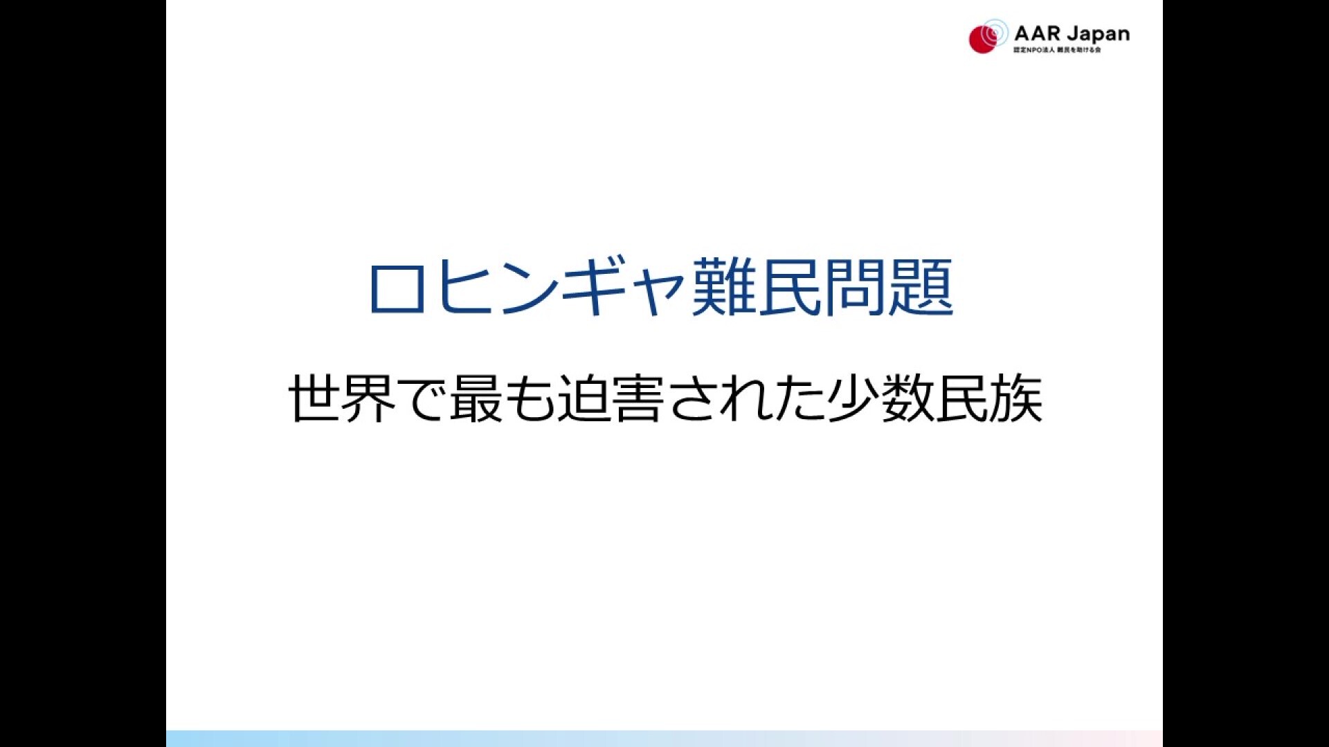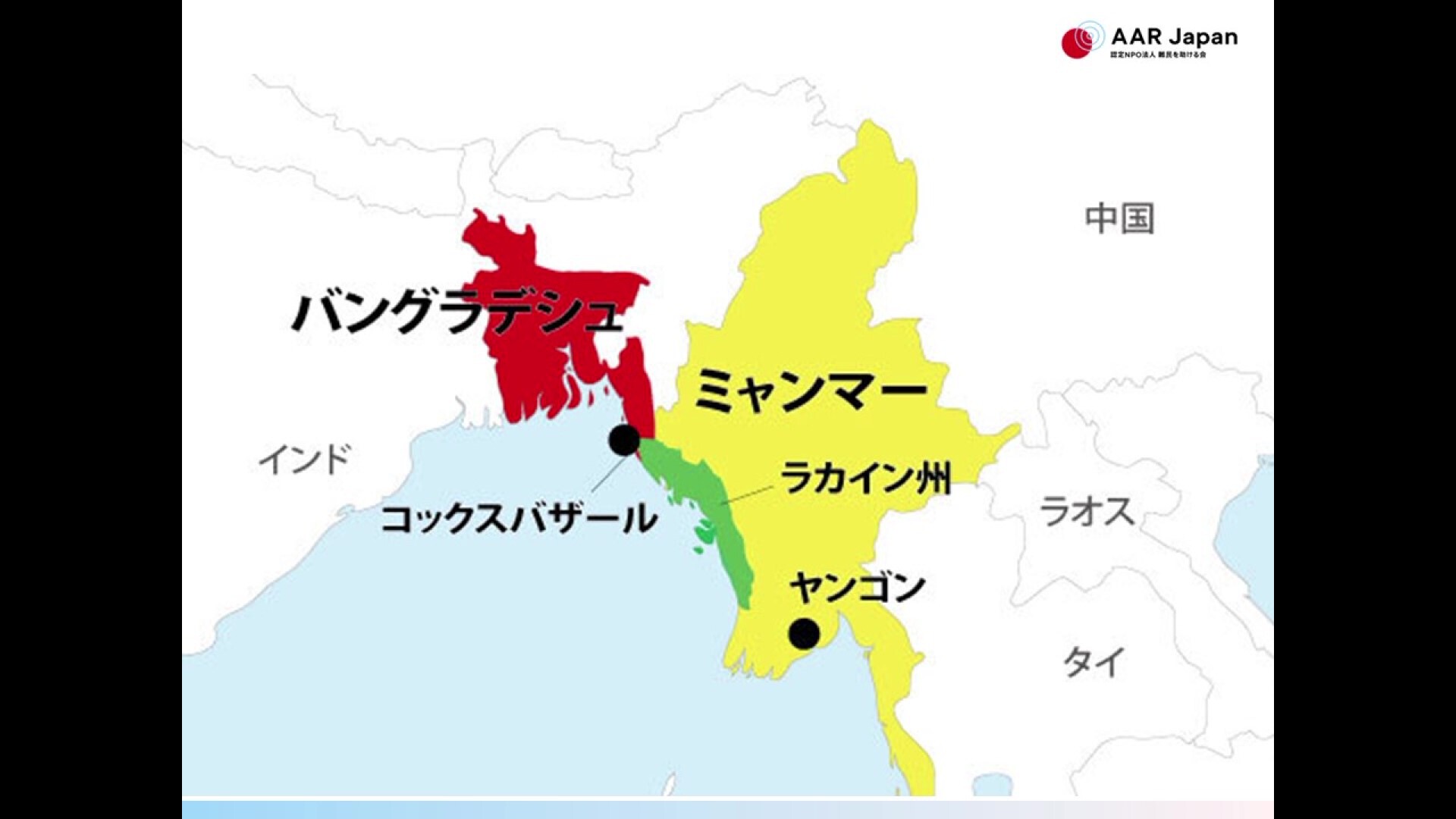 「AAR Japan難民を助ける会」の中坪央暁です。 私は世界の紛争や難民問題について、人道支援とジャーナリズム両方の視点で取材し、発信をしています。 皆さんはロヒンギャという人々をご存知でしょうか? 最近はウクライナ危機の影に隠れてほとんど報道されなくなってしまいましたが、5、6年前には、アジア最大の人道危機として世界の注目を集めていました。 今回はそのロヒンギャ難民問題についてお話したいと思います。ロヒンギャ問題の舞台となるのは東南、アジアのミャンマー、そして西隣のバングラデシュです。