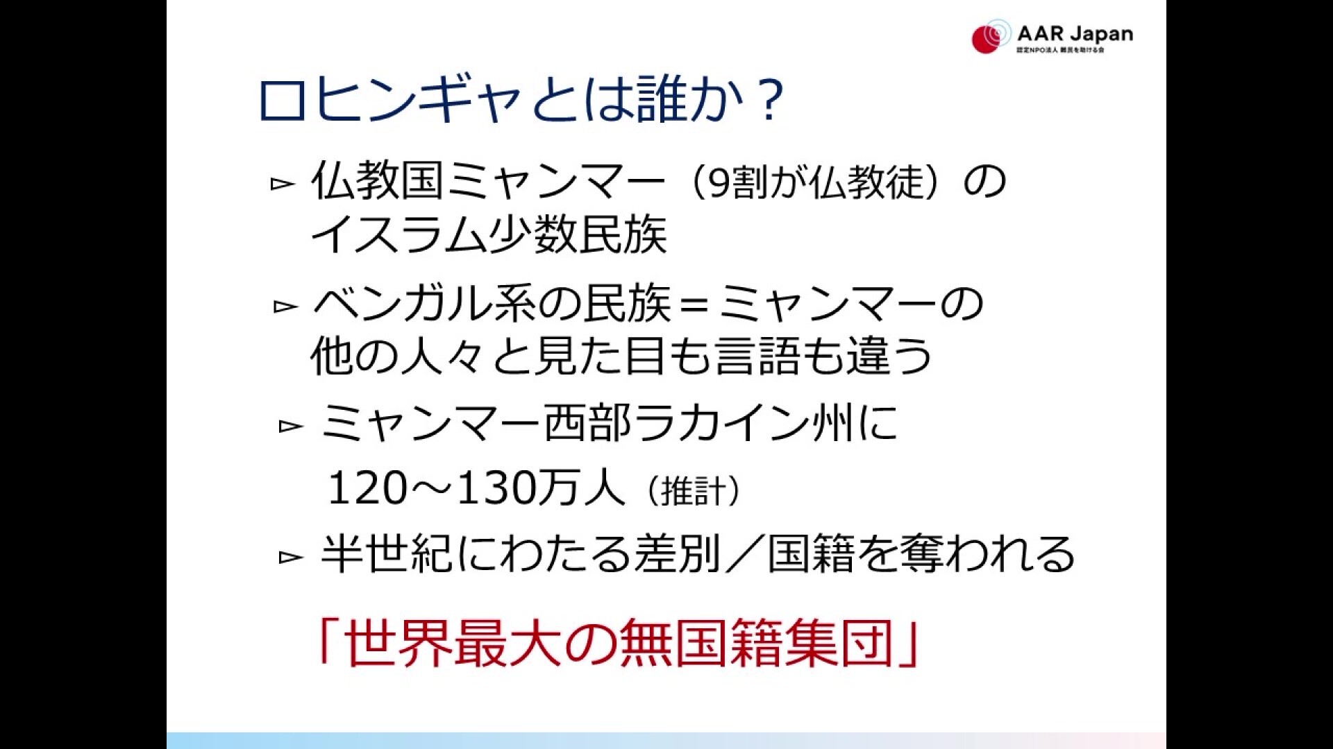 私は2017年から約2年間、AARのバングラデシュ駐在としてコックスバザールという地域にある難民キャンプで支援活動に従事しました。そもそもロヒンギャとは誰かということですが、彼らは仏教国ミャンマーで暮らしていたイスラム少数民族です。民族的にはベンガル系の人々で、ビルマ人など他の民族と見た目も異なり、日常的に使用する言語もビルマ語、ミャンマー語ではなく、ベンガル語の方言を話します。ロヒンギャは1960年代、ミャンマーがまだビルマと呼ばれていた時代に実質的な軍事支配を敷いたネウイン独裁政権によって、ロヒンギャは不法移民集団であり、ビルマ国民ではないと決めつけられ、国籍、市民権を奪われました。その後、半世紀以上にわたって迫害や武力弾圧を受けて世界で最も迫害された少数民族、あるいは世界最大の無国籍集団とも呼ばれています。