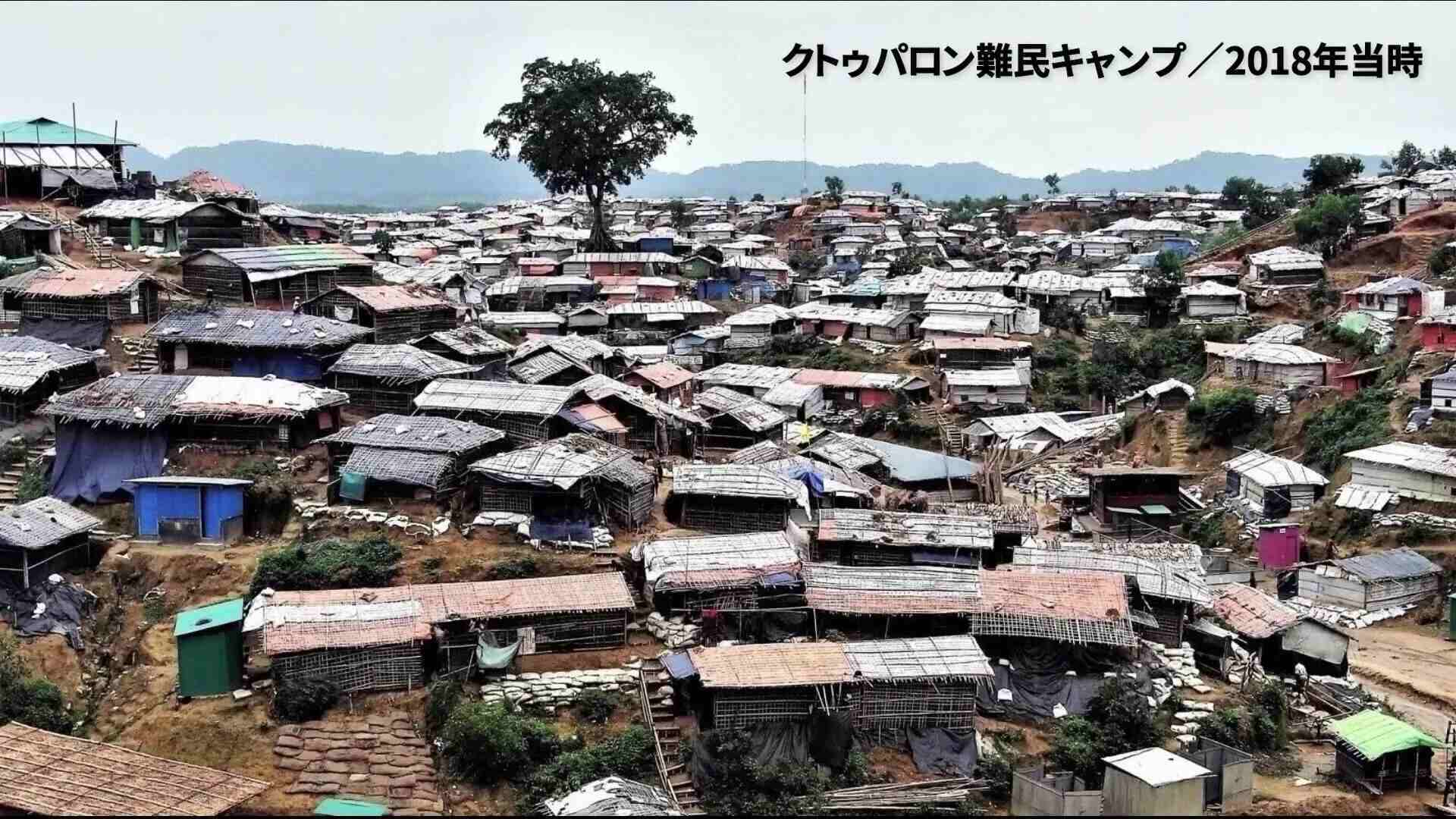 ミャンマーで長年排斥されてきたロヒンギャに対して2017年8月、ミャンマー国軍が徹底的な武力弾圧を行ない70数万人が国境を越えてバングラデシュのコックスバザールという地域に流入する大惨事が発生しました。村々は焼き払われ、住民の虐殺や女性に対する集団レイプが多発しました。死者は少なくとも1万人、あるいは25,000人とも言われています。ちなみに、この大虐殺の首謀者はクーデターを起こしたのと同じミンアンフラインという国軍最高司令官です。コックスバザールには、もともと20万から30万人のロヒンギャ難民がいたと推定され、新たに流入した難民と合わせて、現在累計100万人を超える難民が滞留しています。その多くは世界最大の難民キャンプと言われるクトゥパロンキャンプなど、いくつかのキャンプにすでに5年以上閉じ込められたままになっています。
