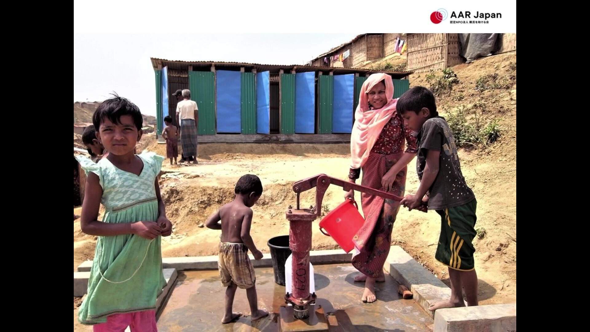 さて、難民キャンプでは国連機関や私たちのようなNGOが、バングラデシュ政府と連携して、食糧供給や保健医療、教育など幅広い人道支援を展開してきました。ここではAARの取り組みを例としてご説明したいと思います。私たちの事業は主に二つの分野があります。最初に実施したのは水、衛生改善事業で、井戸とトイレ、それに水浴び室をたくさん建設しました。水浴びというのは、別にシャワーなどがついているわけではなくて、この写真のようにトタンで囲っただけの単純な施設ですが、これは特に女性の保護のうえで、大きな意味があります。これも私たちが設置した井戸ですが、男性や子供たちはこうして昼間、裸になって水浴びをしますが、女性たちはそうはいきません。そこで安心して水浴びができる場所が欲しいと言うニーズがとても多くて、水浴び室をたくさん作りました。 昼間は洗濯場として使い、夕方にバケツや水差しを持ち込んで水浴びをしています。