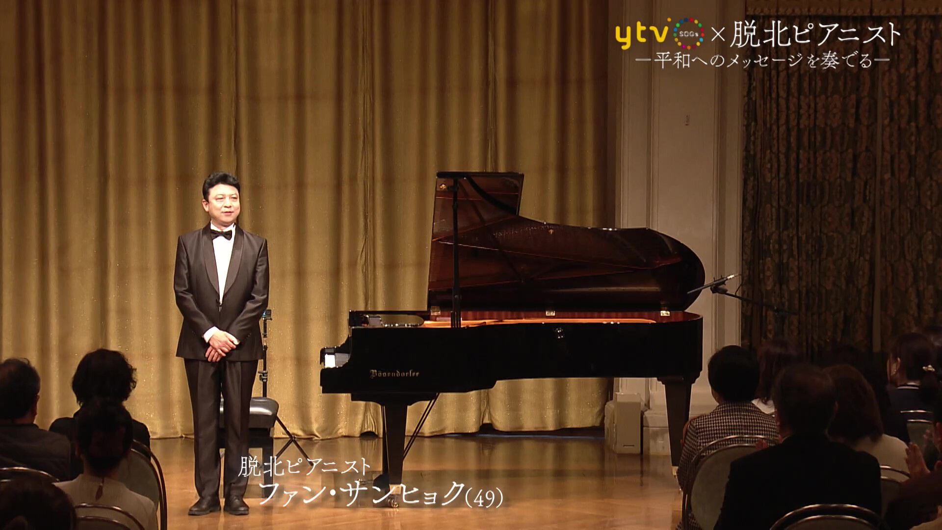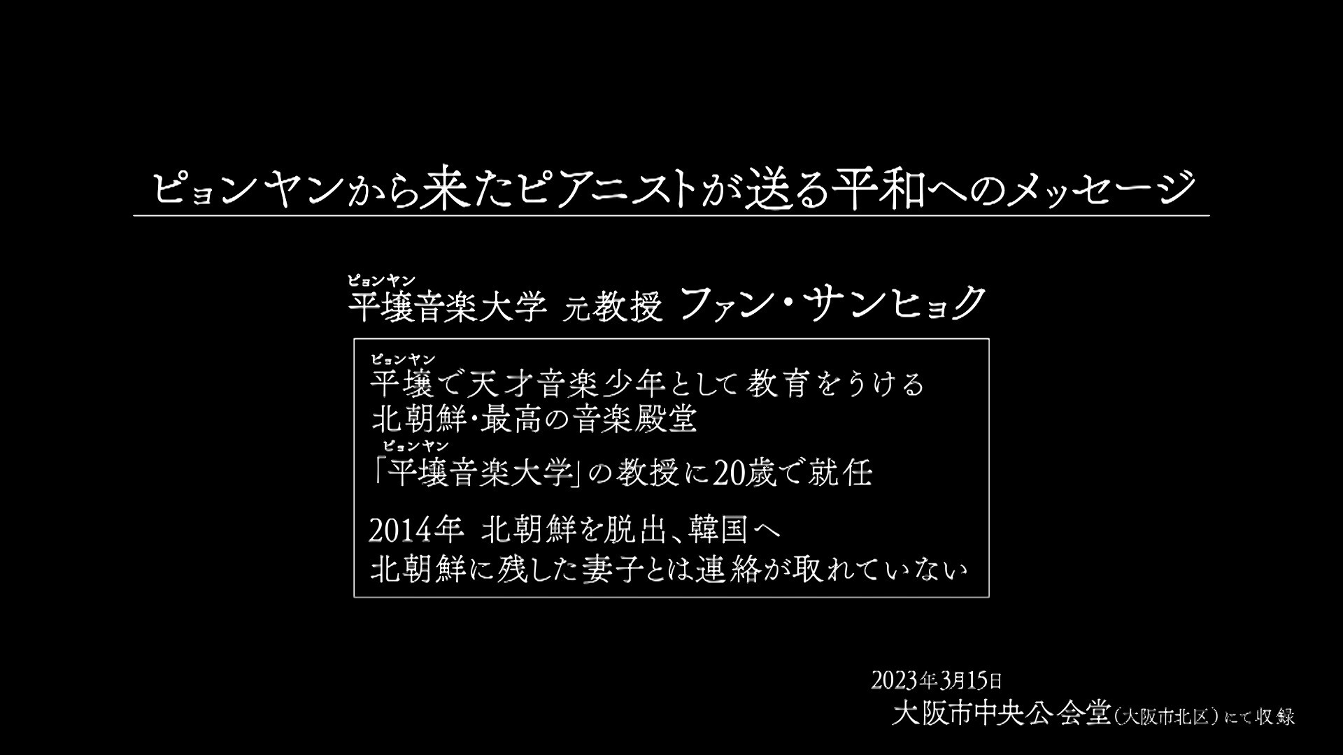 - 北朝鮮で「天才」と呼ばれたひとりのピアニストがいます。名前は、ファン・サンヒョクさん(49)。2014年、身の危険を感じ、スーパーエリートの人生を捨てて、単身北朝鮮を脱出しました。ピョンヤンに残した妻子の消息は不明。ファン氏は現在、韓国でひとり、ひっそりと暮らしています。私たちは今回、朝鮮半島問題の専門家、李相哲教授(龍谷大学)の招きで初来日したファン氏の演奏会に密着。ファン氏が日本で‘たった一度だけ’弾いたピアノに込めた「平和へのメッセージ」を皆さんにお届けしたいと思います。