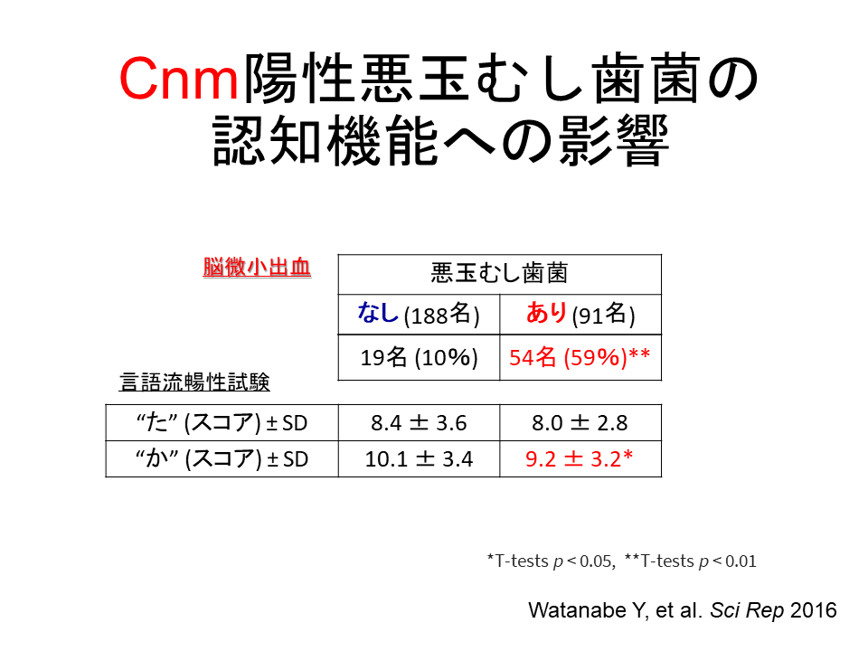 さらに先程、脳卒中の先に認知症があるというお話しをさせていただきました。これも京都府立医科大学で行われた研究ですが、悪玉むし歯菌をお持ちの方というのは当然ながら微小出血をお持ちの頻度は10%対59%で高いという結果でした。言語流暢性試験というものがあります。これは一分間で“た”から始まる言葉、あるいは“か”から始まる言葉をできる限り言ってくださいという試験で、臨床でもよく使う試験ですが、“た”から始まる言葉に関しては、「むし歯菌あり」の方が若干ちょっと少な目でした。これ有意差はないという結果だったのですが、“か”から始まる言葉に関しては明らかに有意な差があり、むし歯菌ありの方が出てくる単語が少なかったということで、まだまだ検診の方々ですので認知機能は一見全く正常です。ただこうした詳しい検査をすると、少し認知機能が落ちかけていることが明らかになり、微小出血が起こる、さらにその先にある認知症が起こりかけているかもしれないということが研究で明らかになったわけです。