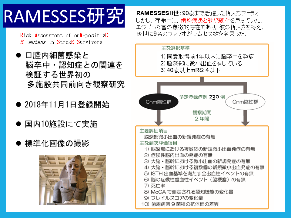 我々は結果を踏まえて「現在前向き研究」を行っています。実際にこの悪玉をお持ちの方とお持ちでない方を2年間ずっと縦断的にフォローアップして、そういう方々が脳出血を起こされるかどうか、さらには認知症を発症されるかどうかを縦断的に研究していまして、「RAMESSES研究」と名付けました。これ「Risk Assessment of cnM-positivE S. mutans in StrokE Suvivors」と若干むりやりRAMESSESに近づけていますが、もうひとつ理由があります。「RAMESSESⅡ世」といわれるエジプトの有名なファラオをご存じの方がおられるかもしれませんが、史実によりますとRAMESSESⅡ世が歯科疾患と動脈硬化を患っておられたということが書かれています。そうすると、もしかしたらRAMESSESⅡ世も悪玉むし歯菌をお持ちだったのではないかという想像も交えて、今回RAMESSES研究を行っておりまして、2018年から開始して、登録とフォローアップがほぼ終わりかけています。今年度中にすべての患者さんの2年間のフォローアップが終了しますので、この悪玉むし歯菌がいかに悪いかということが証明できるのではないかと期待しています。実際は国内の10施設以上の施設に参画いただきまして、2018年時点での研究体制ですので、若干異動等で構成員は変わっていますが、この研究で悪玉虫歯菌の役割、脳卒中における役割を明らかにしたいと思っております。