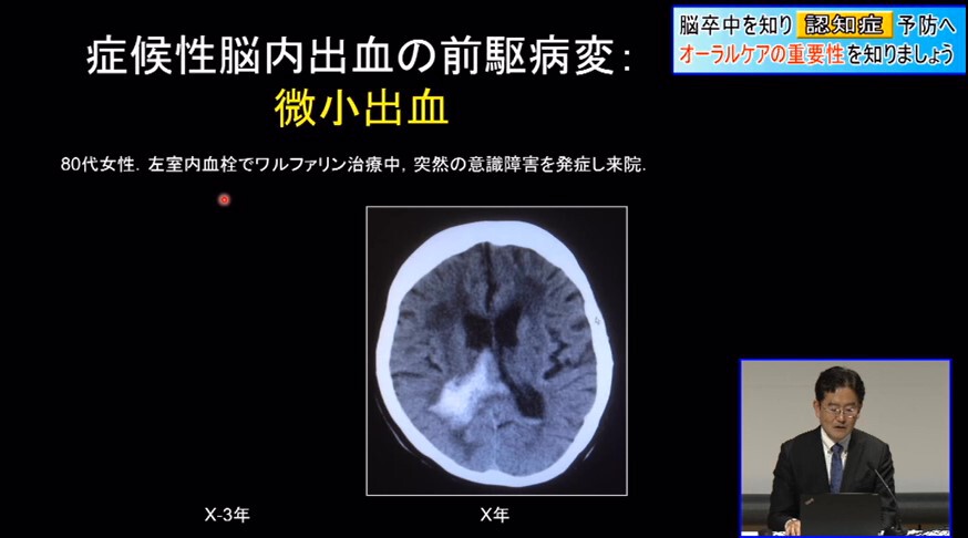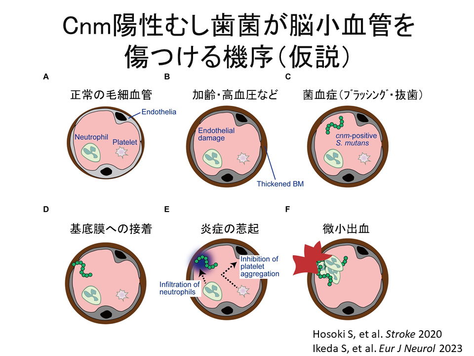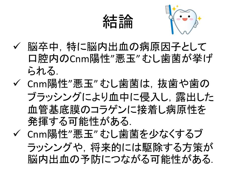 以上をまとめますと、脳卒中の中でも特にこの出血は、アジア人・日本人に多いと言われている脳内出血ですが、かつては高血圧を管理しましょう、禁煙しましょうということで、なんとかリスク管理を行う中で、ここにきて下げ止まってきました。したがって、新たなリスクを探さないといけないという中で、どうもこの「悪玉むし歯菌」が悪さをしているということがわかってきたということです。実はこうしたむし歯菌は容易に血液中に入り込んで、心臓弁にも脳血管にも悪さをしています。特に悪玉むし歯菌が、脳血管に悪さをしているということがわかってきました。この悪玉むし歯菌を減らす方法を企業と一緒に開発していて、タブレットかあるいは歯磨き粉によって、口腔内の環境を整えて脳卒中を予防する術・方法をこれから研究していく予定にしております。