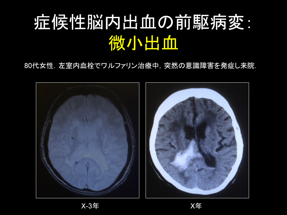 我々、脳出血の方々を普段から多く見ております。ある時、80代の女性の方が脳出血を起こされて病院にお越しになりました。過去にほかの病院でMRIを撮られていたことがわかり、そのMRIを取り寄せてみました。そうすると、実は3年前にここに小さな出血の、黒い点があるのがおわかりになろうかと思います。この時は当然、無症状でしたが、この小さな出血を起点に大きな出血が起こったと想定されます。したがって、小さな出血は症状がなくとも侮れない病変であることがおわかりになろうかと思います。