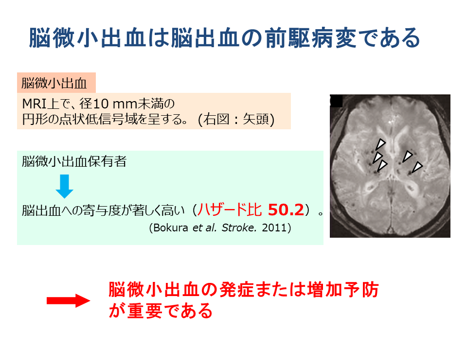これまでの研究では、微小出血をお持ちの方とお持ちでない方を比べると、微小出血をお持ちだと将来、脳出血を起こされる、こうした大きな出血につながる危険と頻度が大体10倍にはねあがるといわれていますので、1個でもあれば要注意という変化になります。これがその研究ですが、特に国内では50倍という数字もあり、微小出血というのはこの時点で、なんらかの介入をしなければならないといわれています。つまりこの脳微小出血が大きな出血につながる、あるいはこの小さな出血が増えるということをなんとか予防しないといけないといわれています。