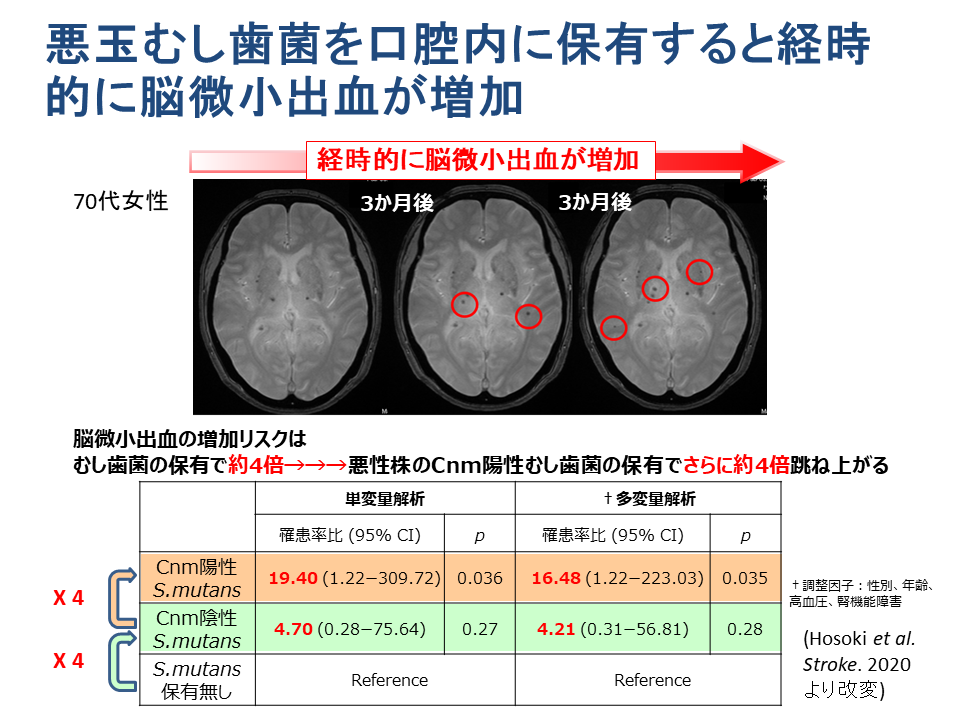 我々の国循で行った研究がこちらですが、実はこの検診を受けられた方を対象に、京都府立医科大学でも似たような研究が行われました。そこで、この悪玉をお持ちであるかないか、さらに微小出血をお持ちであるか否かというのを調べると、このオッズ比という数字で表されていますが、この悪玉むし歯菌をお持ちの方というのは微小出血を持っている頻度が有意に高いということが、我々の研究でも、さらに検診を受けられた方の研究でも明らかになったということになります。