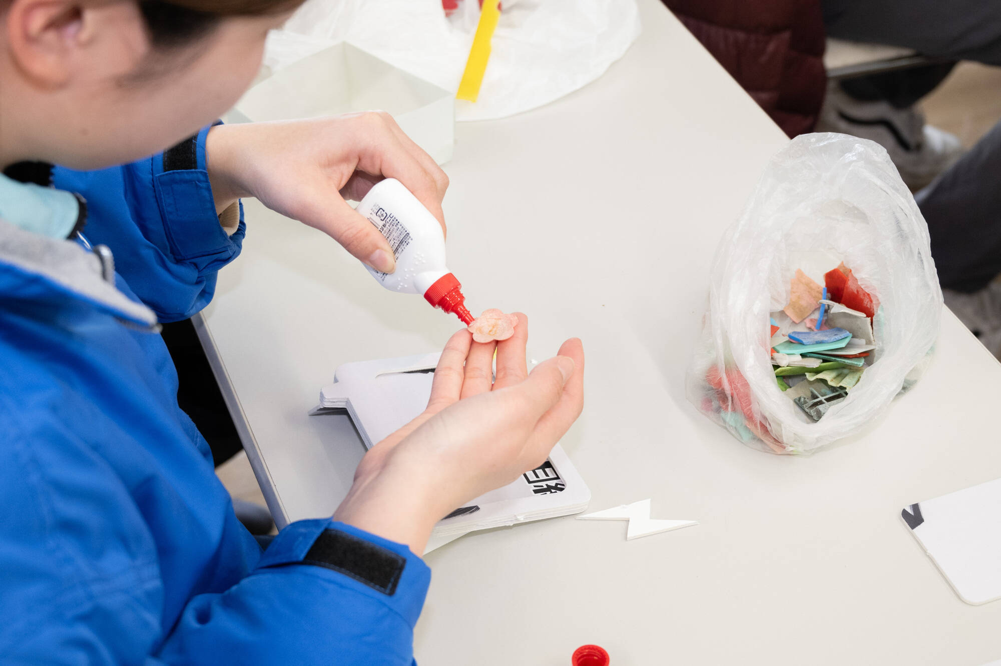 “アップサイクル(創造的再利用)”のワークショップ「フリップで何つくる?」では、読売テレビの番組内で実際に使ったフリップを材料に、参加したボランティアの方々が手作りのフォトフレームを制作しました。装飾の材料には、琵琶湖で回収したプラスチック片が使われました。