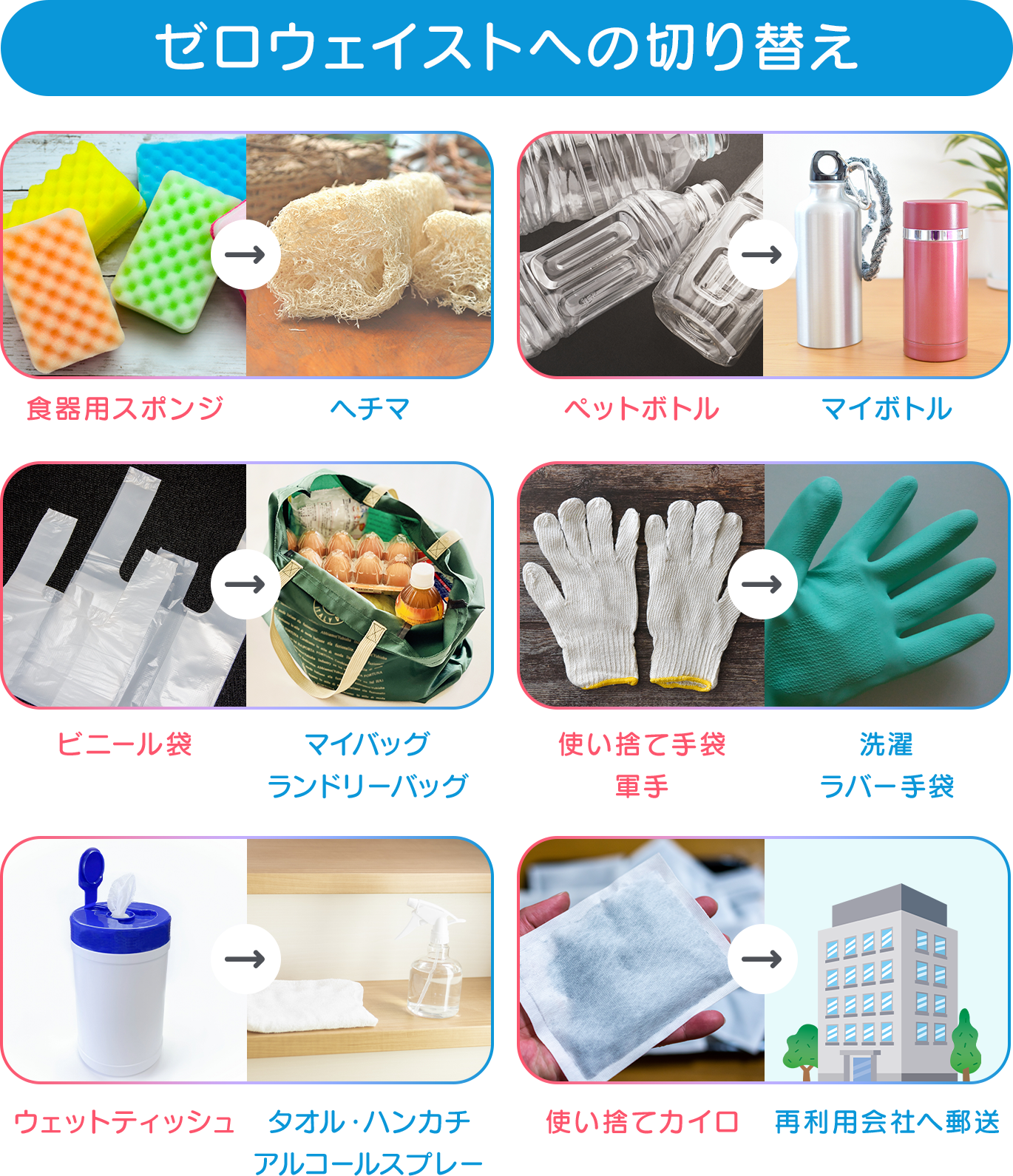 「ゴミを出さない取り組み=ゼロウェイスト」を意識した上で、普段の活動や日常生活を振り返ってみると、案外ゴミを出していたことに気が付きました。清掃活動で取り組める「ゼロウェイスト」について実現可能なものを模索していきます。今回の清掃活動では以下の備品を“ゼロウェイスト仕様”にすることとなりました。