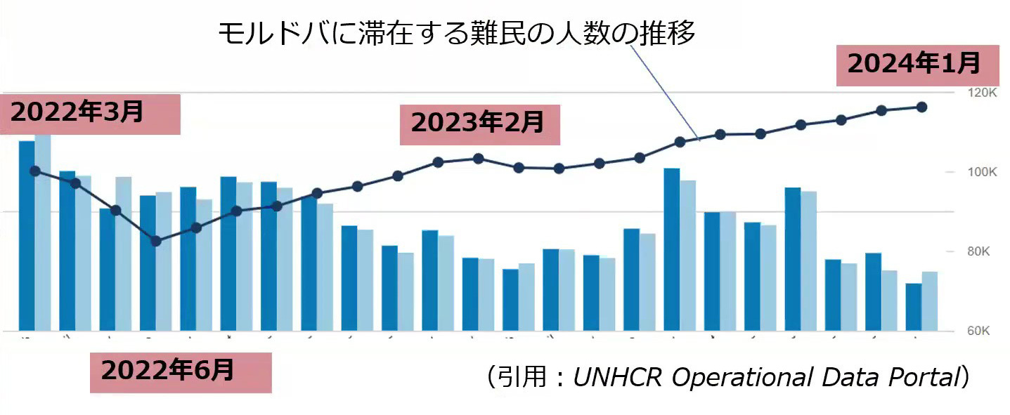 モルドバ事務所の今野聖巳(こんの・さとみ)と申します。私からは、ウクライナの隣国モルドバにおける難民の現状と、AARが提供している支援についてお話をさせていただきます。モルドバには現在も12万人ほどの難民が滞在しています。この青い折れ線グラフが現在、モルドバに滞在している難民の数を示していますが、全体としては、滞在者数は減ってはいない状況です。モルドバの南東部と国境接しているウクライナのオデーサ州をはじめとして、多くの地域で引き続き攻撃が続いていることもあり、当初はすぐにウクライナに帰るという予定だった人たちも、なかなか帰還することが難しく、モルドバにとどまっている状況です。冬期は、ロシアからのインフラの攻撃もありますので、そういったところから避難してこられる方も冬場は特に多くなります。こうした状況から全体の人数は微増していて、高止まりを続けているような状況です。
