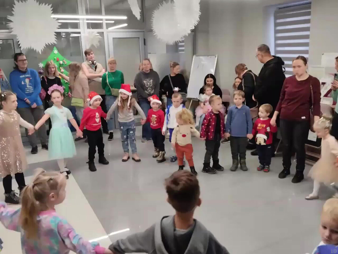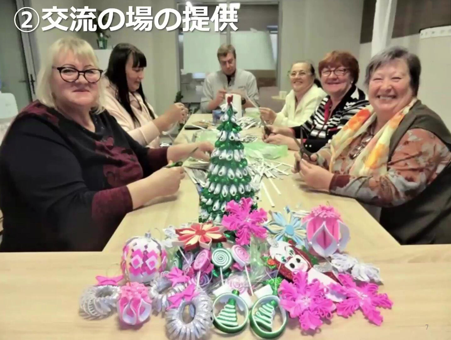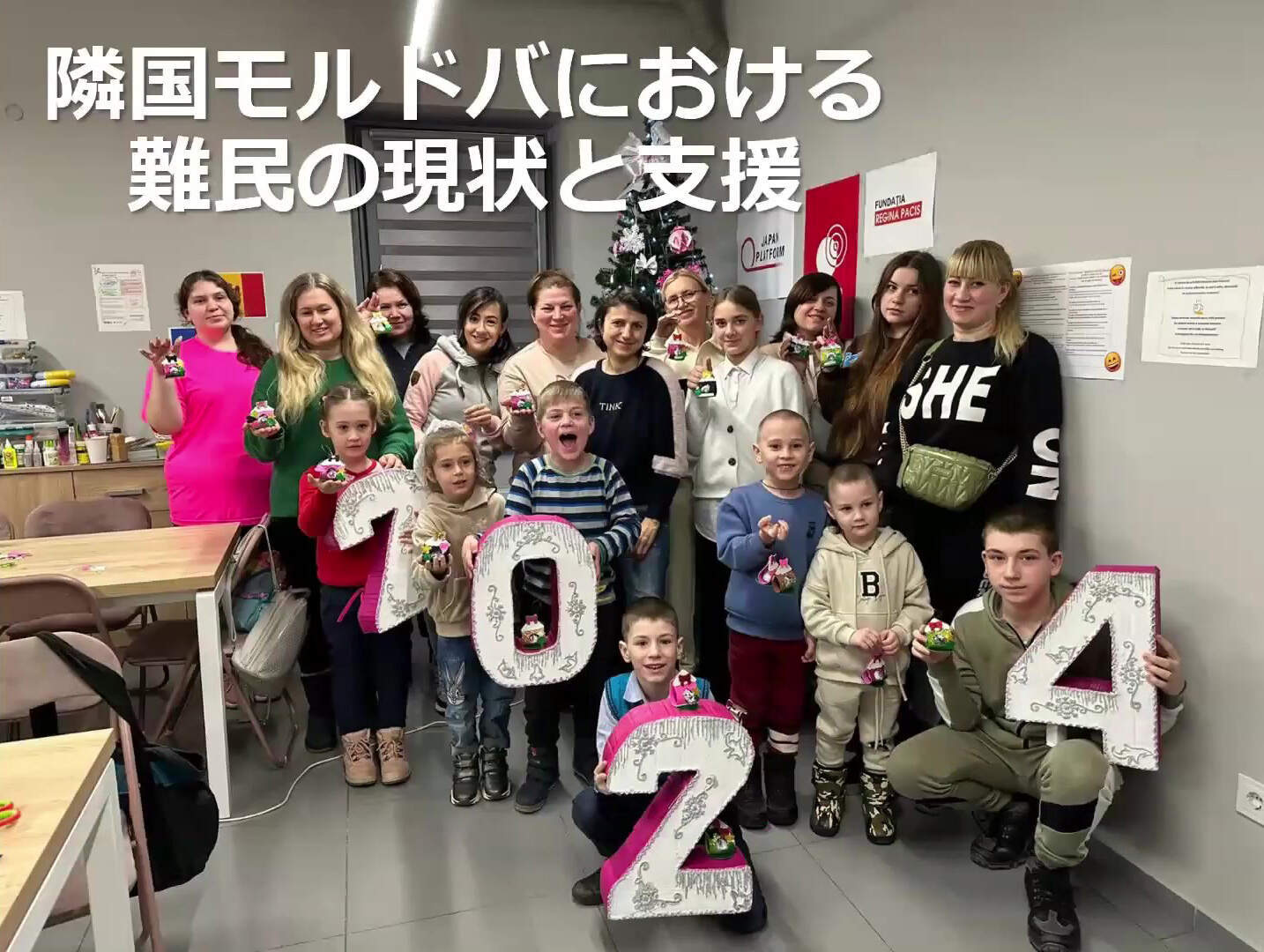 この写真はセンターでのクリスマス飾りを作っているウクライナ難民のボランティアの皆さんの様子です。センターではモルドバの祝日に合わせてイベントを開き、日本文化を体験するワークショップなどを開催して、センターに継続して訪れて利用してもらえるような活動を行っています。こちらはクリスマスに実施した親子向けのイベントの様子です。難民の子どもだけではなく、地元の子どもも参加してみんなで交流を楽しんでいます。歌と踊りを楽しんでいる様子です。