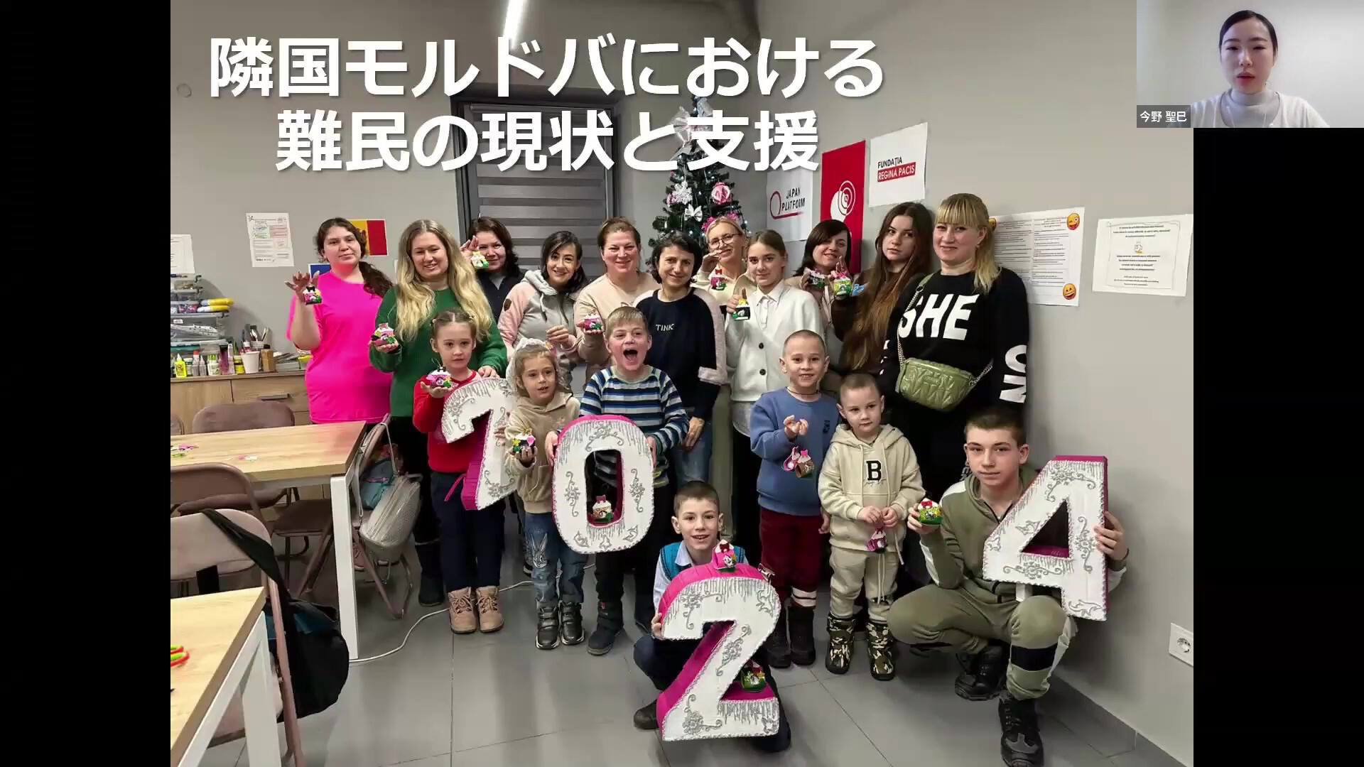 彼女はハルキウ州から避難してきた大学生です。彼女はモルドバの大学で教育学を専攻しており、週に一度、センターで子どもたちに算数の勉強を教えてくれています。彼女は「難民施設で一人暮らしをしている私にとって、このセンターを自分の家のような場所です。ウクライナにいる家族のことはすごく心配ですが、この場所に来ると落ち着くことができます」と話をしてくれました。もちろん難民の方々に話を聞くと、皆さんは口々に「早くウクライナに帰りたい、家族に会いたい」とおっしゃいます。しかし、先の見えない避難生活の中で、それぞれが少しでも心のよりどころを見つけて、ウクライナに帰れる日を待ち望んでいます。私たちの授業では、そういった方々を支えるために日々活動を行っています。ご清聴いただきありがとうございました。