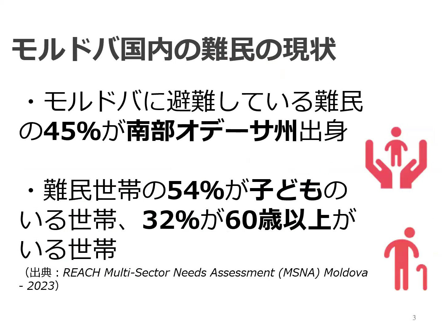 難民の出身地としては、南部のオデーサ州から来られる方が一番多いです。子供やお年寄りがいる世帯が多くなっています。避難生活が長引いていく中で、様々な課題が生じています。例えば、モルドバの滞在資格を取得しない難民に関しては、公的サービスへのアクセスが難しくなっていくことや、難民が身を寄せていた滞在施設が次々と閉鎖していることですとか、あとは子供の教育に関しては、今までウクライナのオンライン学習を子供にさせていたけれども、現地の学校に入れるかどうか、頭を悩ませているといった声もよく聞かれます。