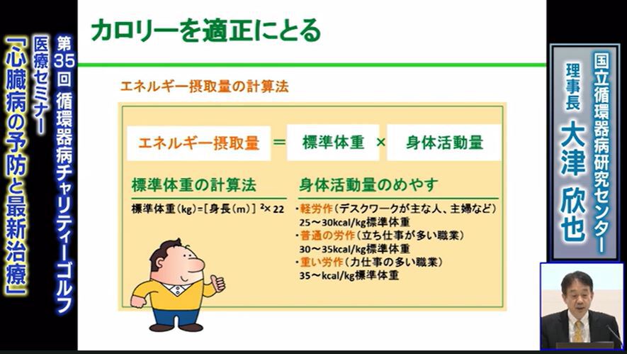 自分にとって適切なカロリー(エネルギー摂取量)はどのくらいかということを頭に入れておく必要があります。検診の結果を見ると標準体重が書かれていると思います。その標準体重あたりに労作、軽労作、普通労作、重労作、それに従ってどのくらいのカロリー数を取ったらいいかということが分かります。一度これを計算してみてください。
