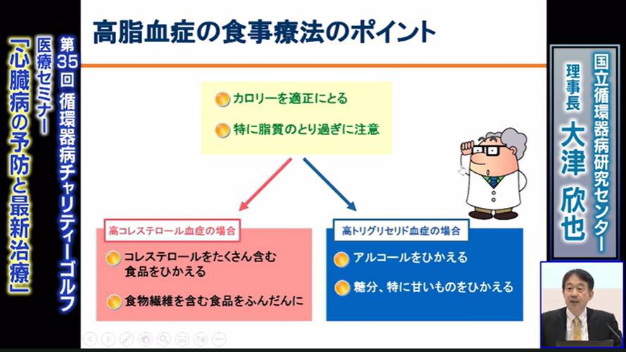 次に、高脂血症、高コレステロール血症、高中性脂肪血症を食事療法でどのように治していくかということですけれども、やはり一番はカロリーを適正にとるということです。高コレステロール血症の場合は、コレステロールをたくさん含む食品を控える、食物繊維を含む食品をふんだんに摂取することが必要となります。高中性脂肪血症はアルコールと肥満によって上昇しますので、アルコールを少し控えていただくこと、そして糖分を控えることが重要になってきます。