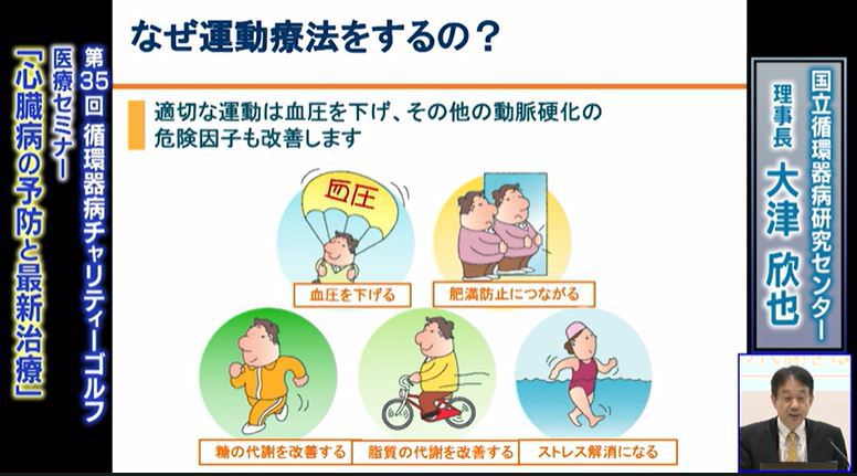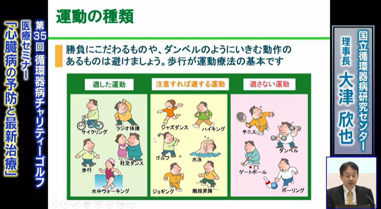 どういう運動かというとやはり有酸素運動、歩行が一番良いです。その他にサイクリング、ラジオ体操、水中ウォーキング、特に膝の悪い方には、水中ウォーキングあるいはサイクリングが適しています。競争など、力むような運動はこの目的に関しては、適さないということになります。