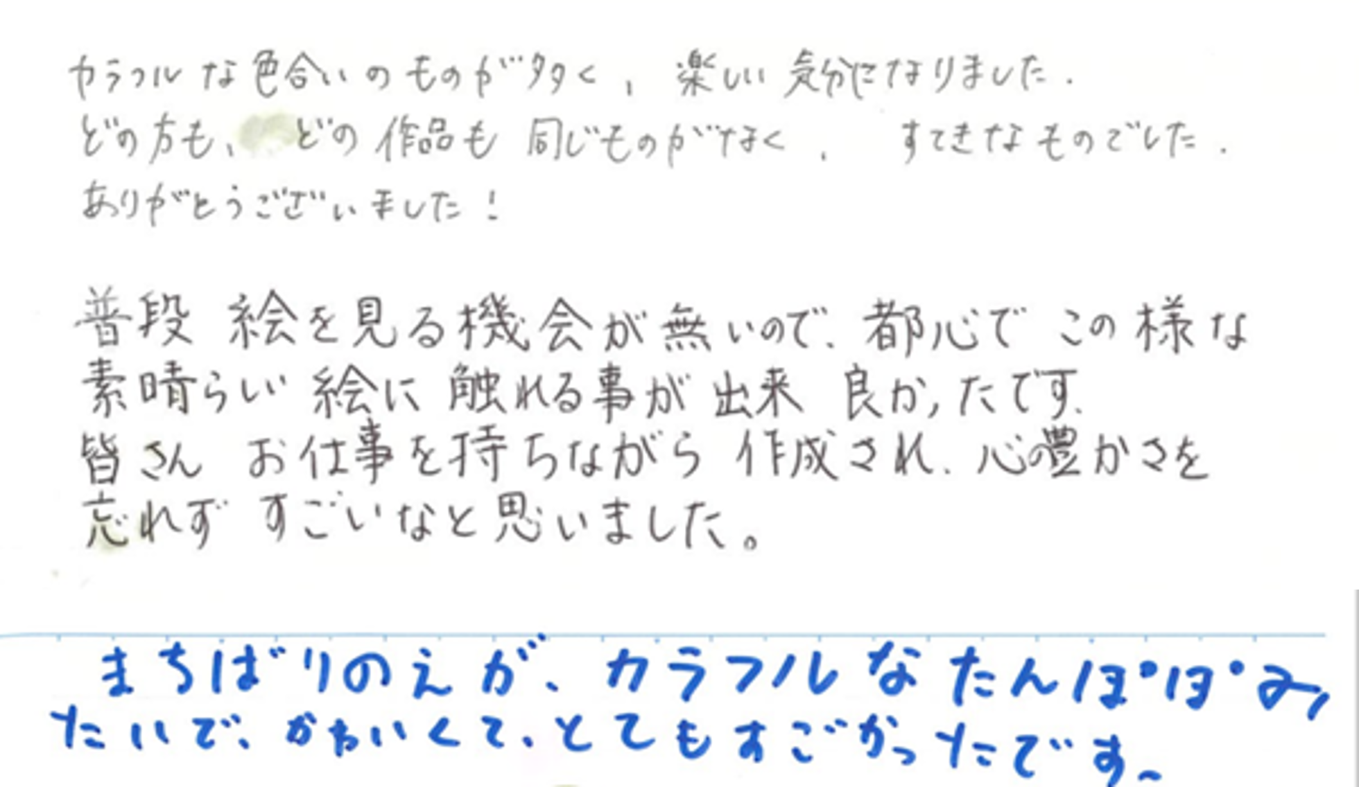 障害の特性から言葉によるコミュニケーションが少し苦手な方もおられますが1枚1枚の絵には、その時の作者の目線や感覚が伸びやかに描かれており、作品を鑑賞した方からは「どの絵も個性的で楽しいものばかりでした」「カラフルな絵ばかりで心が温かくなりました」など、素敵な感想をいただきました。