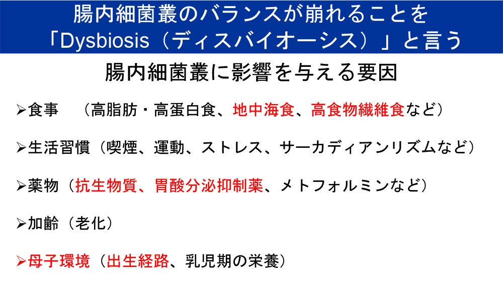 また生活習慣や我々が日々摂取する薬物、特に風邪を引いた時に抗生物質を飲まれる方が多いかと思います。しかし、抗生物質を飲むと腸の中に住んでいる大事な善玉菌が失われてしまい腸の中の菌のバランスが崩れることが警鐘として鳴らされています。また胃潰瘍もしくは逆流性食道炎で胃酸分泌抑制薬を飲まれる方も多いかと思いますが、これらも非常に悪い影響を与えることが分かっています。また加齢で腸内細菌のバランスが崩れることも分かってきています。この腸内細菌はそもそもお母さんから由来するということも分かってきています。特にお母さんからどのように生まれてくるか、出生経路や母乳・ミルク・人工乳で育てられたか?等が影響して、腸内細菌のバランスや組成が変わってくることが分かってきています 。