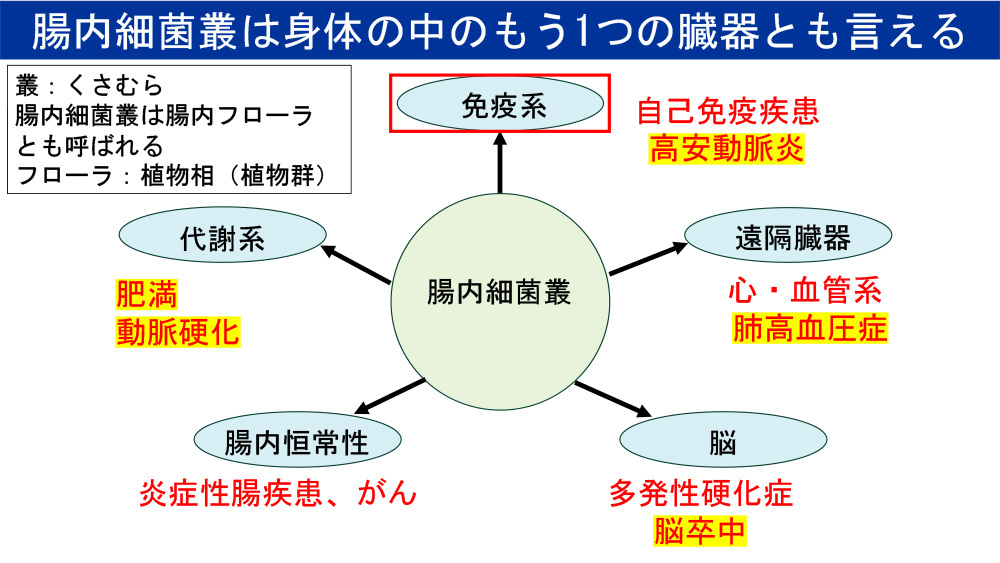 腸内細菌という言葉は「腸内細菌叢」とも言われます。叢というのは草むらという意味をする漢字で別名「腸内フローラ」とも言われます。フローラとは植物叢・植物群と言って、森をイメージしていただくと森には高い木も低い木、またコケから生まれた菌など、いろんなものが住んでいます。それと同じようなものが腸内細菌層という言われるイメージです。これらの状態が体の免疫状態に影響を与え自己免疫疾患の発症を制御したり、肥満 動脈硬化といった循環器病とも深く関係します。また腸の炎症状態=炎症性腸疾患と呼ばれるような病気や大腸がん・胃がんなどの発症とも関係しており、多発性硬化症、脳卒中そして自閉症などの精神疾患にも大きな影響を腸内細菌が与えるということが分かってきています。腸内細菌層がどういう条件に影響を受けるかということも近年の研究から明らかになってきました。