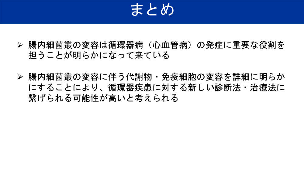 以上、腸内細菌と、腸と心臓や循環器の血管は非常に離れた遠隔臓器の関係にあります。しかし腸の中の環境が悪くなることで循環器の病気が起きていることを私たちも明らかにしてきましたし、先達の世界でも有名な研究者がその関連性を示しています。よって腸の中の環境を良くすることが重要で、循環器病の予防や治療が可能になるということが期待されています。