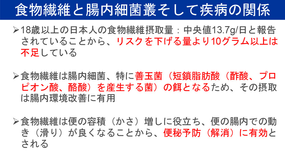 では食物繊維はどうして腸に良いのでしょうか。これは善玉菌と呼ばれる菌、これは主に短鎖脂肪酸酢酸(酢酸、プロピオン酸、酪酸)を作る菌の餌になるというのが医学的に重要だと言われています。食物繊維は便通を良くし最終的に大腸がんになりにくい効果も発揮します。短鎖脂肪酸というのは酢酸、プロピオン酸、酪酸と呼ばれるもので、大腸に最も多く存在する有機酸と言われています。これらがたくさん存在することで大腸は酸性に維持され、これらの善玉菌が住みやすい環境を作る物質だと言われています。この餌になるのが食物繊維であり、これらをある程度摂ると酢酸・酪酸・プロピオン酸がこのような代謝経路で菌によって生成、吸収され、腸上皮細胞の栄養源になり、人間の臓器にいい影響を与えて健康を維持することが分かっています。日々の食生活で食物繊維の摂食やバランスの良い食事を通じて、腸内細菌のバラエティを富む状態を維持してください。