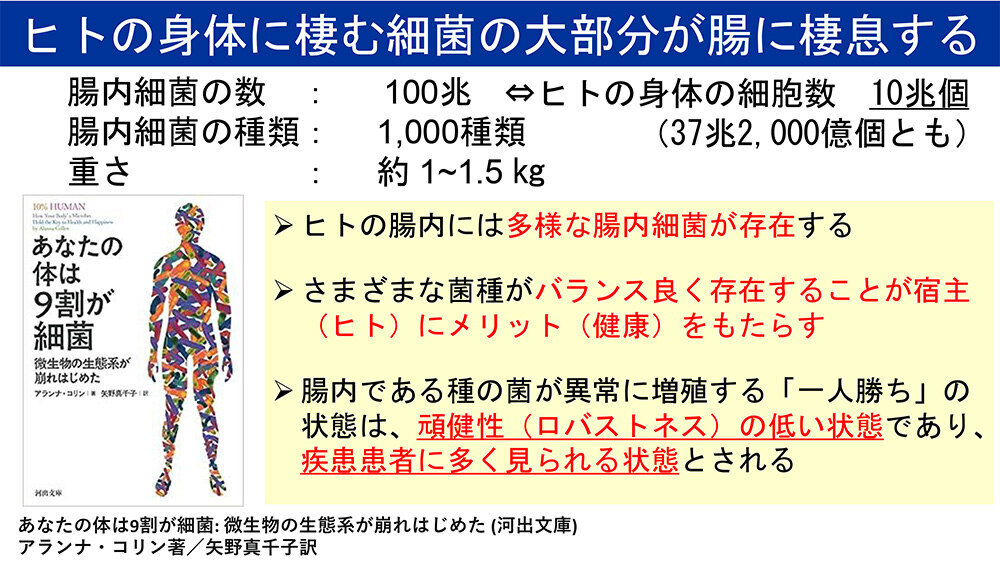 腸内細菌は100兆個、種類にして1000種類、重さにすると人間1人の体に1kg~1.5kgです。肝臓の重さが1.5kgと言われており、肝臓の重さと同じぐらいの菌が体の中に住んでいるということになります。人間の細胞数は10兆とも37兆とも言われていますので、腸内細菌の数はその数よりも多いということになります。この腸の中にいる多様な1000種類もの菌が、バランスよく存在していることが人間にとってメリットになるというのが最近の考えです。一方で、腸内ではある種の菌が異常に増えてしまって一人勝ちになったような状態、バランスを失った状態というのは、その頑健性が失われて低い状態になっていて、疾病状態に多く見られる状態だと考えられており、いかに腸の中の菌のバランスをよく保つかというのが健康に重要な鍵を握るということがわかってきています。