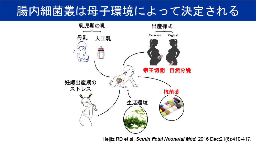 お母さんから得られる腸内細菌ということについて出産の様式には主に2つあります。自然分娩=お母さんの膣から正常に産道を経て子宮から出てくるプロセス。もう1つは様々な理由で子宮に直接メスを入れて産道を通らずに外に取り出す=帝王切開です。この2つの出産の様式によって生まれてきた赤ちゃんの腸内細菌層が大きく異なることが近年の研究から分かってきました。さらに驚くべきことに帝王切開で生まれた赤ちゃんは大人になった時に高血圧などの生活習慣病になりやすいということも疫学的に最近証明されつつあります。自然分娩の過程を経て、お母さんの産道と産道の出口のすぐそばにある肛門、その周辺で赤ちゃんはお母さんから腸の中の菌を受け継ぐわけです。そのプロセスが正常にされないと、赤ちゃんが病気になりやすい。そこで最近の試みでは、帝王切開の赤ちゃんにもお母さんの便の内容物、もしくは膣やその肛門周辺の菌をガーゼなどで赤ちゃんの口に含ませるなど、自然分娩に近づけることで病気になりにくい体を作らせようというような試みもあり、驚きに値します。また3歳までの間に子供の腸内細菌は大人に近い状態に成熟化すると言われています。お母さんから頂いた菌を成熟化するプロセスに約3年かかるわけです。その重要な時期に抗生物質を飲むと肥満や喘息などのアレルギー疾患の罹患率が上がるということが言われています。子供も熱を出すと抗生物質が安易に出されていた時期がありますが、こういった抗菌薬を飲むことで子供の腸内細菌、ひいては大人になった時の菌叢のバランスが崩れてしまうことも言われており、安易にこういった薬剤を飲まない方がいいということが言われています。またお母さんからの母乳もしくは人工乳の栄養で腸内細菌の形成も変わることが言われていますし、都会に住んでいるか田舎にいて周りに動物がいる環境、もしくはペットと一緒に住んでいるかどうかで頑健性の高い、良いバランスの腸内細菌ができるかが異なるということも近年の研究から分かってきています。