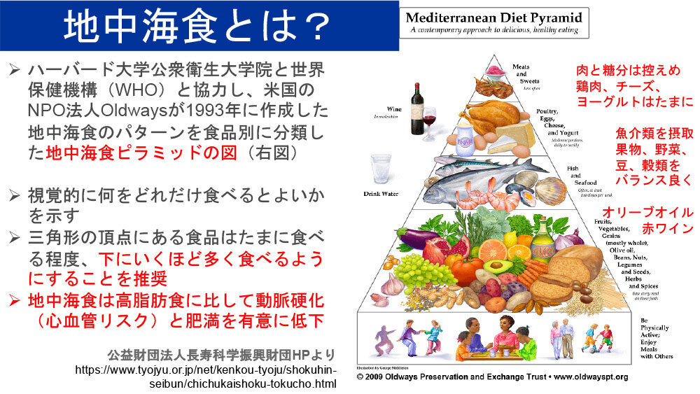 地中海食というのは、地中海ピラミッド図で表されるような食事になります。上にあるものはたまに摂ることが推奨され、下に行けば行くほどたくさん頻繁に摂ることが推奨されています。肉や糖分は控えめで、鶏肉やチーズ・ヨーグルトはたまに、魚介類や果物・野菜・豆類・穀類をバランスよく摂りながら、オリーブオイルや赤ワインをできるだけ摂っていくのが地中海沿岸のギリシャやスペイン・ポルトガルなどの国々で摂られている食事です。一般的なハイファットな西欧色の強い食事に比べて、地中海食は動脈硬化 心血管リスクや肥満を有意に低下するということが、疫学的に分かってきました。我々日本人が食する和食も、地中海食に準じて健康にはいいのではないかということが言われてはいますが実際に疫学的にはまだ証明されておらず、今後研究でその効果が医学的に証明されることは望まれると思っております。