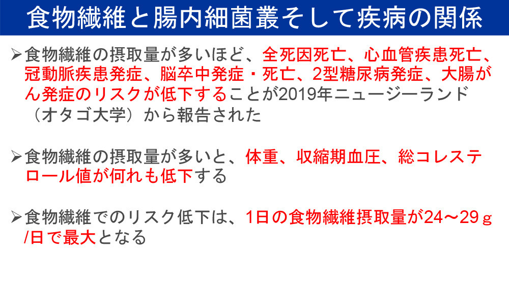 水溶性食物繊維は水に溶け、ゲル状になって消化吸収、特に糖分などの吸収をゆっくりさせる効果があります。大麦 もち麦や果物 海藻類に多く含まれます。一方、不溶性食物繊維は水に溶けづらく、固く、消化されにくく、水分を吸収し体積をかさ増して、腸の運動を活発にし便通を良くするものです。これらは穀類・芋類・豆類・根菜類に多く含まれ、糖質とコレステロールの吸収を緩やかにする性質があり健康に非常に重要だと言われています。実際にこの食物繊維摂取量が多いと、全死因死亡、心血管疾患による死亡、冠動脈疾患、脳卒中の発症・死亡、糖尿病、大腸がんなどのリスクが減るということがニュージーランドの疫学研究で報告されました。