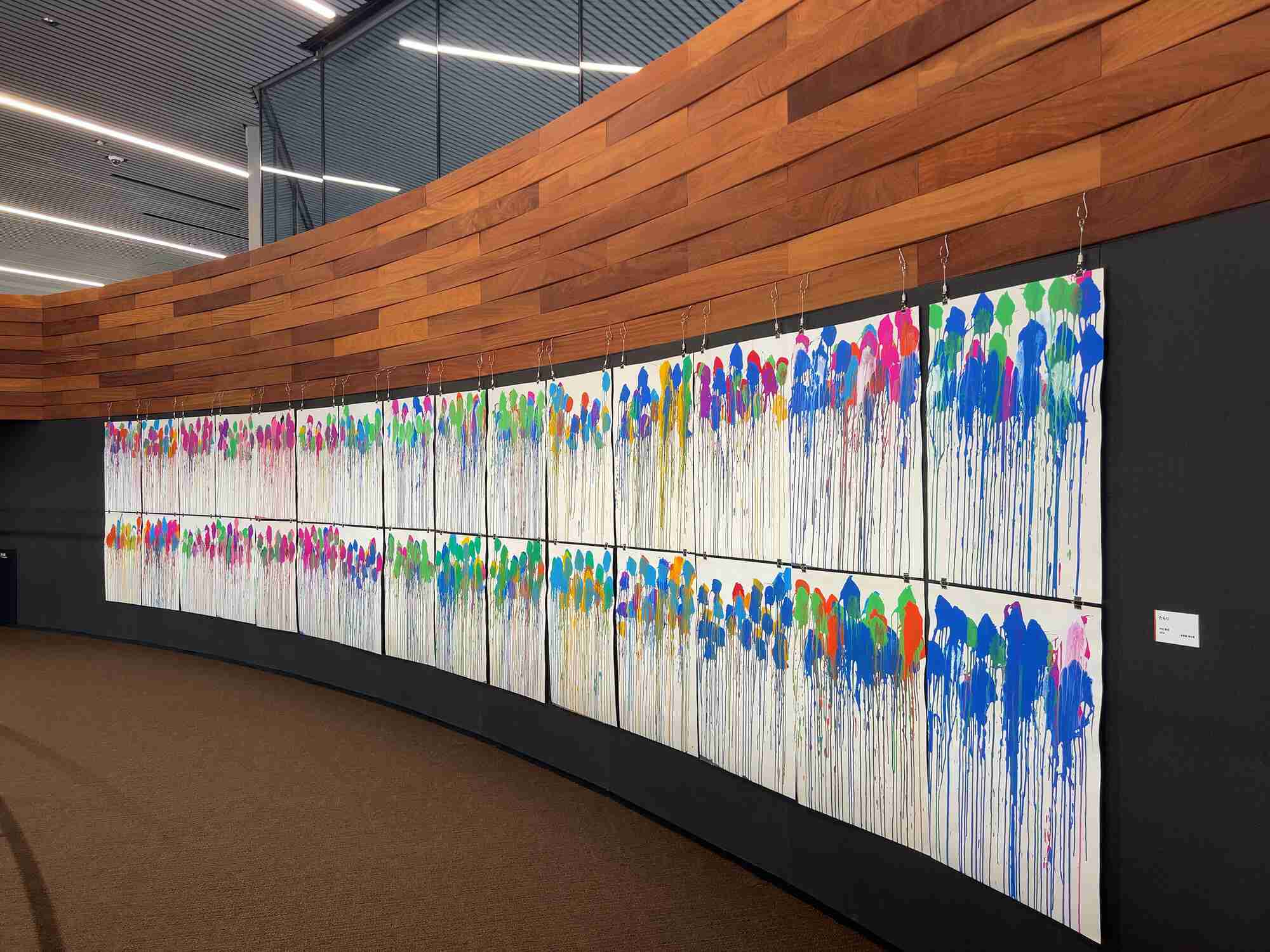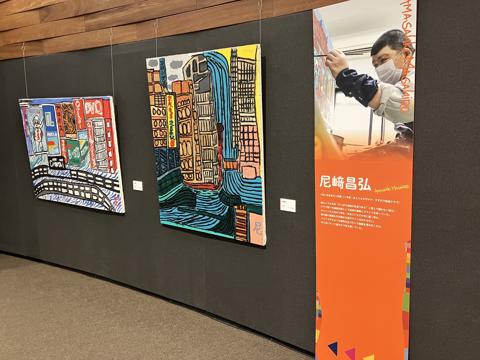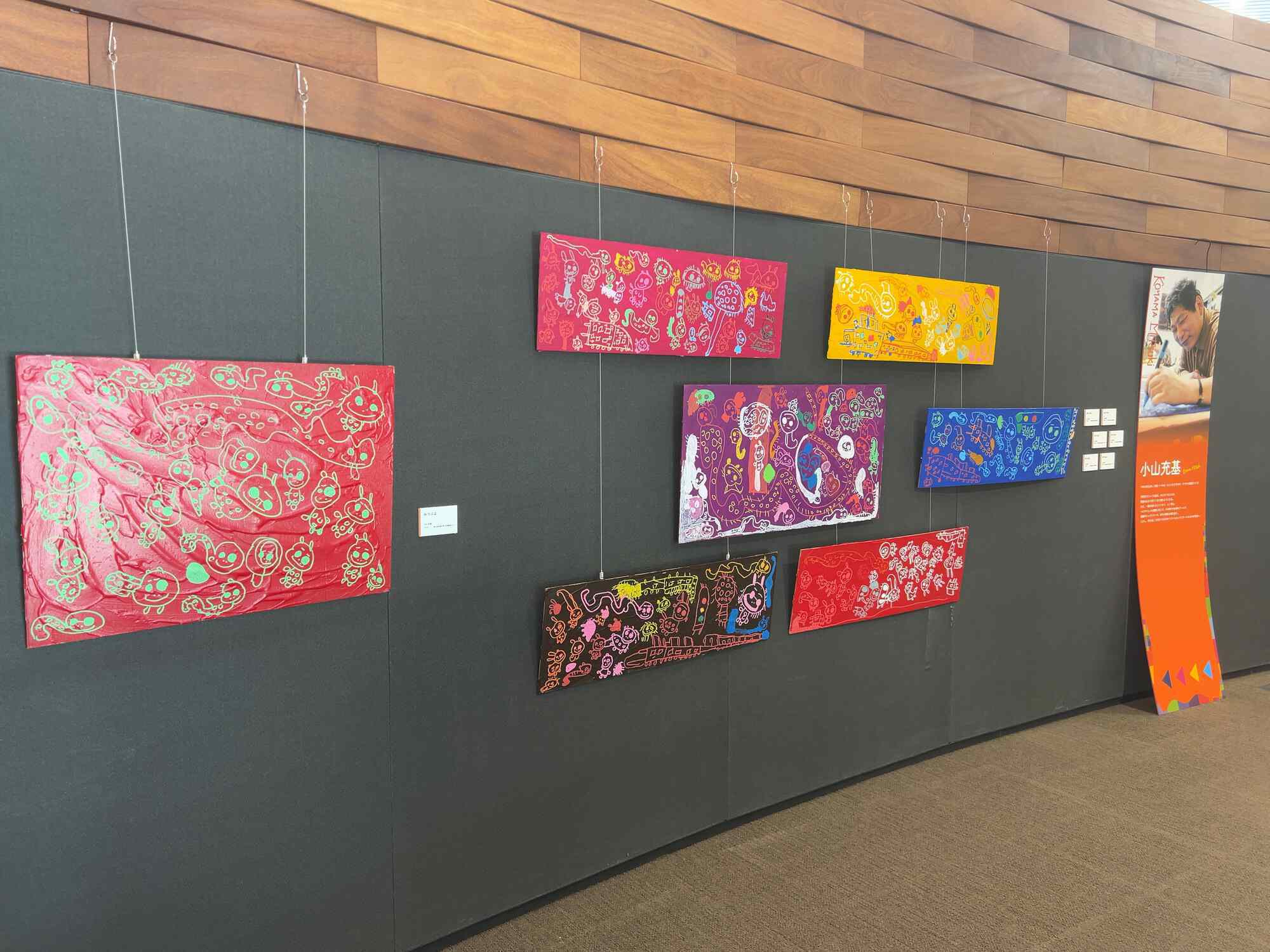 普段、作家の皆さんは兵庫県西宮市の作業所で働いています。そんな彼らが創作活動をはじめると、自由な発想でカンバスを色鮮やかに染めていきます。そのだいたんな色合いや線に、多くの方々が足を止めていました。今回の展示は様々な方にご覧いただけるよう、展示位置を従来の高さよりも低めに調整するなどバリアフリーに配慮し、車いすで来場の方や子供たちにも作品を楽しんでいただけるように取り組みました。