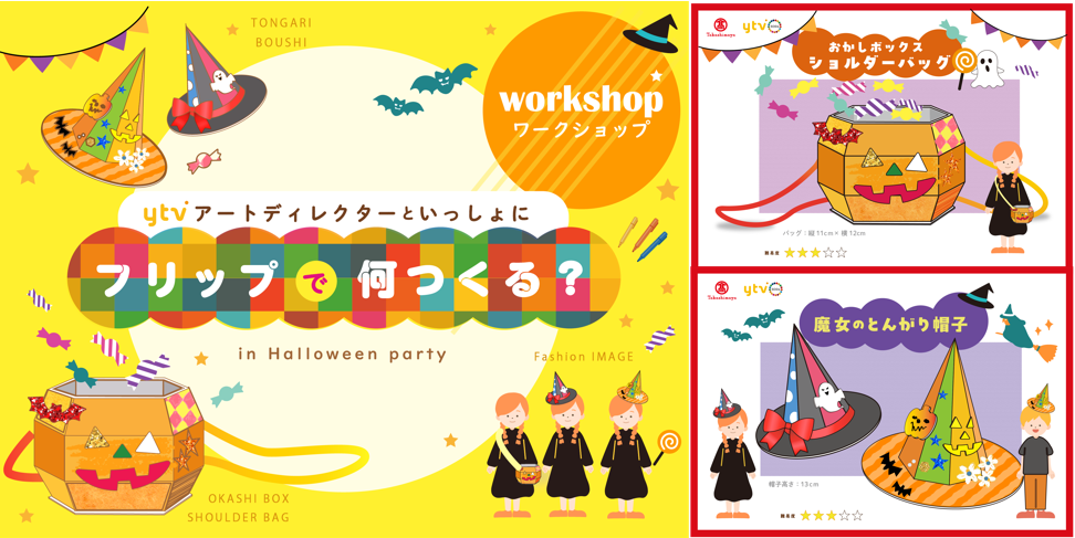 社外での初実施!「ytvサステナビリティ・プロジェクト」と髙島屋大阪店の「TSUNAGU ACTION WEEKS」が、コラボレーションして実現しました。今回はハロウィン・パーティーをイメージした特別仕様の企画。“子ども達が身に着けて楽しめる作品”というコンセプトから生まれた「お菓子ショルダーバック」と「魔法使いのトンガリ帽子」の2作品は、「フリップで何つくる?」初の“ファッション・コレクション”シリーズです。