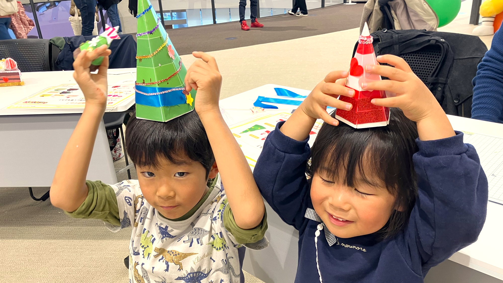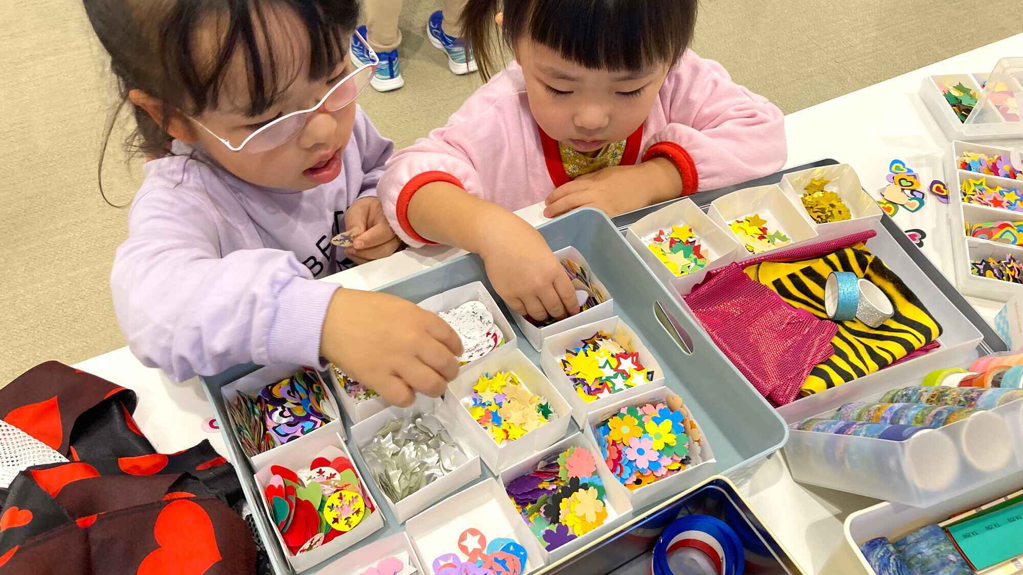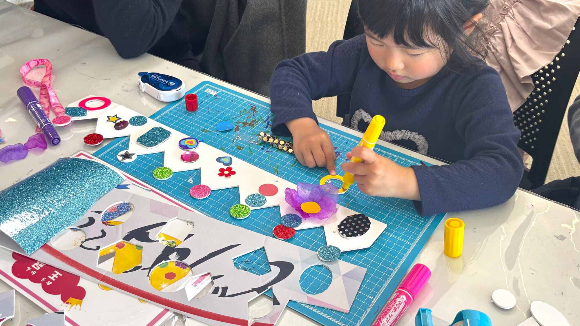 今回は「宝物みっけ!」をテーマに「王冠」と「宝箱」をモチーフとした“ファッション・コレクション”シリーズ2作品を用意。兄弟姉妹・お友達と協力して制作する子どもたち。今回は剣や指輪・ダイヤや鍵など、様々な“宝物”をモチーフにしたパーツが多いメニューのため、みんなで協力してつくっている子どもたちが多かったです。